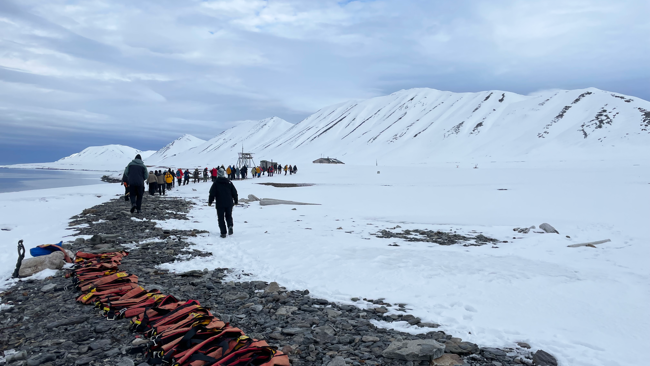 Vi landsteg och hade förmånen att se färska isbjörnsavtryck som passerade stugområdet - tassavtryck från en mamma och en unge. Efter att ha inspekterat spåren och lyssnat till lokala berättelser gick vi på en vandring längs strandlinjen. Vi såg Svalbardsrenar och fjällripor och avslutade med att plocka upp skräp längs strandlinjen.