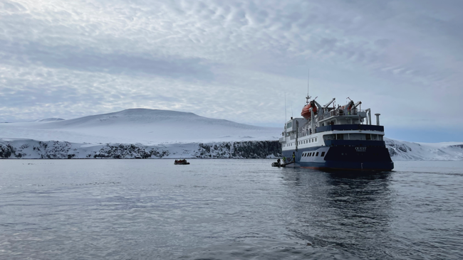 Vi vaknade upp till vinden som piskade mot fönstren på vårt fartyg M/S Quest. När vi gav oss djupare in i Liefdefjord blev det stilla, och vi kunde sänka ner gummibåtarna vattnet. Även om vädret var grått och snöigt, visade det sig bli en härlig två timmars kryssning längs iskanten, där vi delade berättelser från Svalbard.