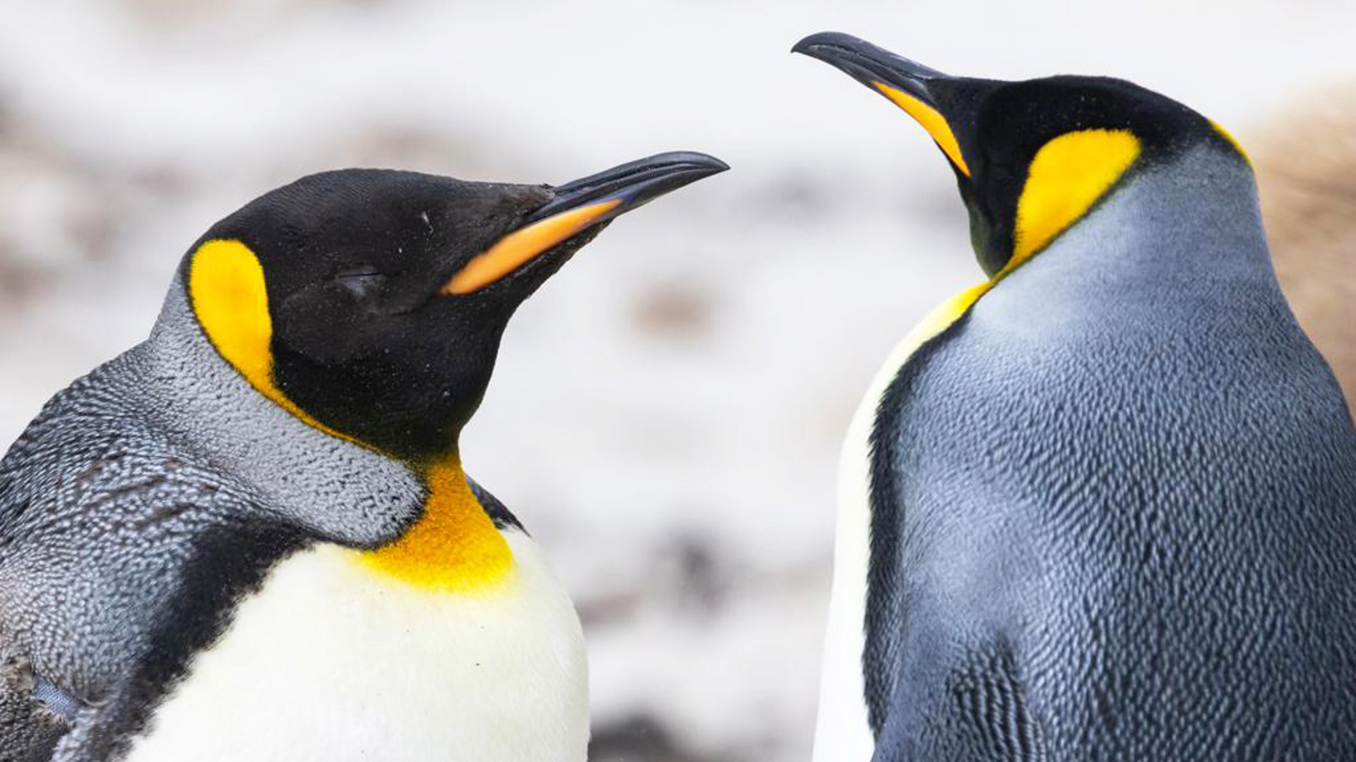 Redan efter ett par hundra meter kom vi till andra sidan av det smala näset och möttes av åsynen av en ännu större och vitare sandstrand än den vi landstigit på. Här vaggade ännu fler gentoopingviner omkring, men i en klunga för sig själva stod även en mindre koloni av kungspingviner, både vuxna exemplar och fjolårsungar. Ungarna var vid det här laget nästan lika stora som de vuxna, men ändå är de helt beroende av föräldrarna för sin överlevnad. Detta eftersom de fortfarande, under sin andra sommar i livet, är iklädda sin fluffiga bruna ungfågeldräkt, som till skillnad från de vuxnas inte är vattentät.