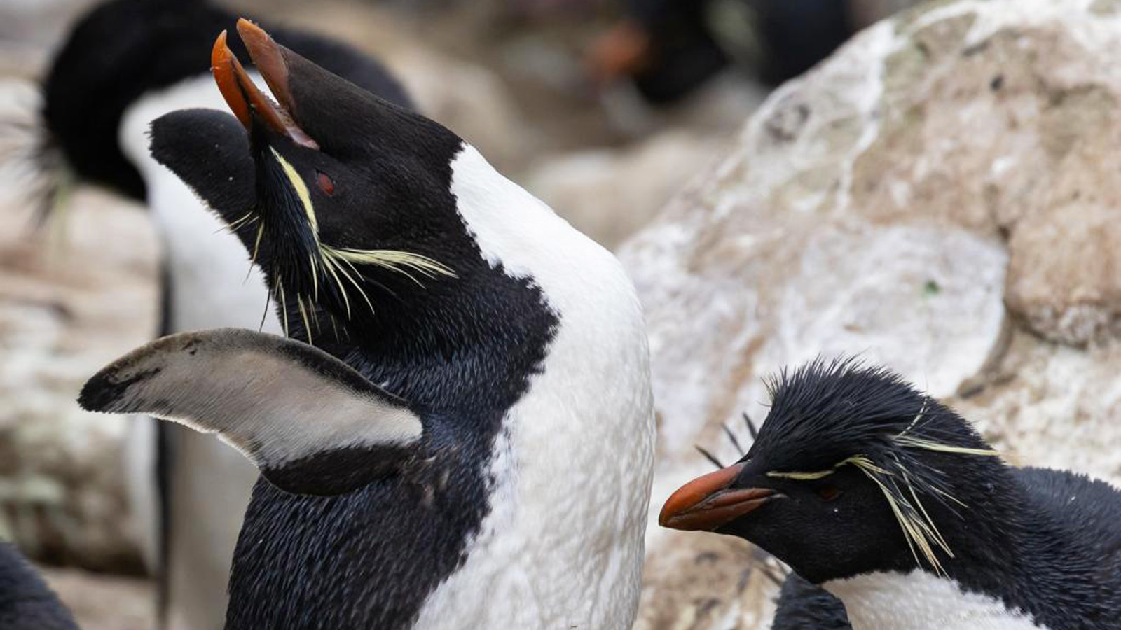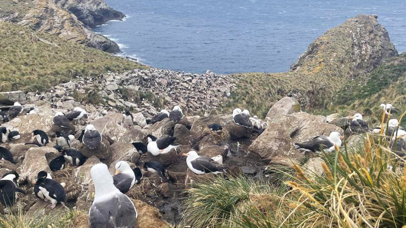Där delades häckningsplatserna på den steniga slänten broderligt mellan mängder av klipphopparpingviner och svartbrynade albatrosser, vissa grannar kom bra överens, medan andra ständigt smågnabbades om utrymmet. En albatross glidflög majestätiskt och till synes helt utan ansträngning ner på klippan och hälsade ömsint på sin utvalda partner genom att de en lång stund gnuggade näbbarna mot varandra.
