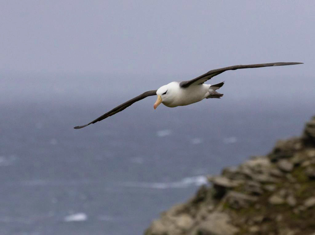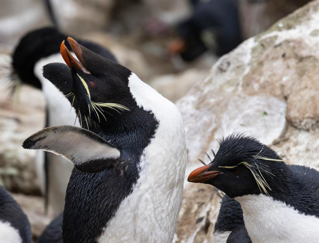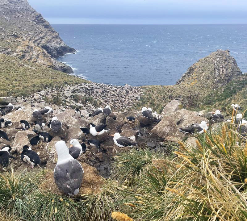 Där delades häckningsplatserna på den steniga slänten broderligt mellan mängder av klipphopparpingviner och svartbrynade albatrosser, vissa grannar kom bra överens, medan andra ständigt smågnabbades om utrymmet. En albatross glidflög majestätiskt och till synes helt utan ansträngning ner på klippan och hälsade ömsint på sin utvalda partner genom att de en lång stund gnuggade näbbarna mot varandra.