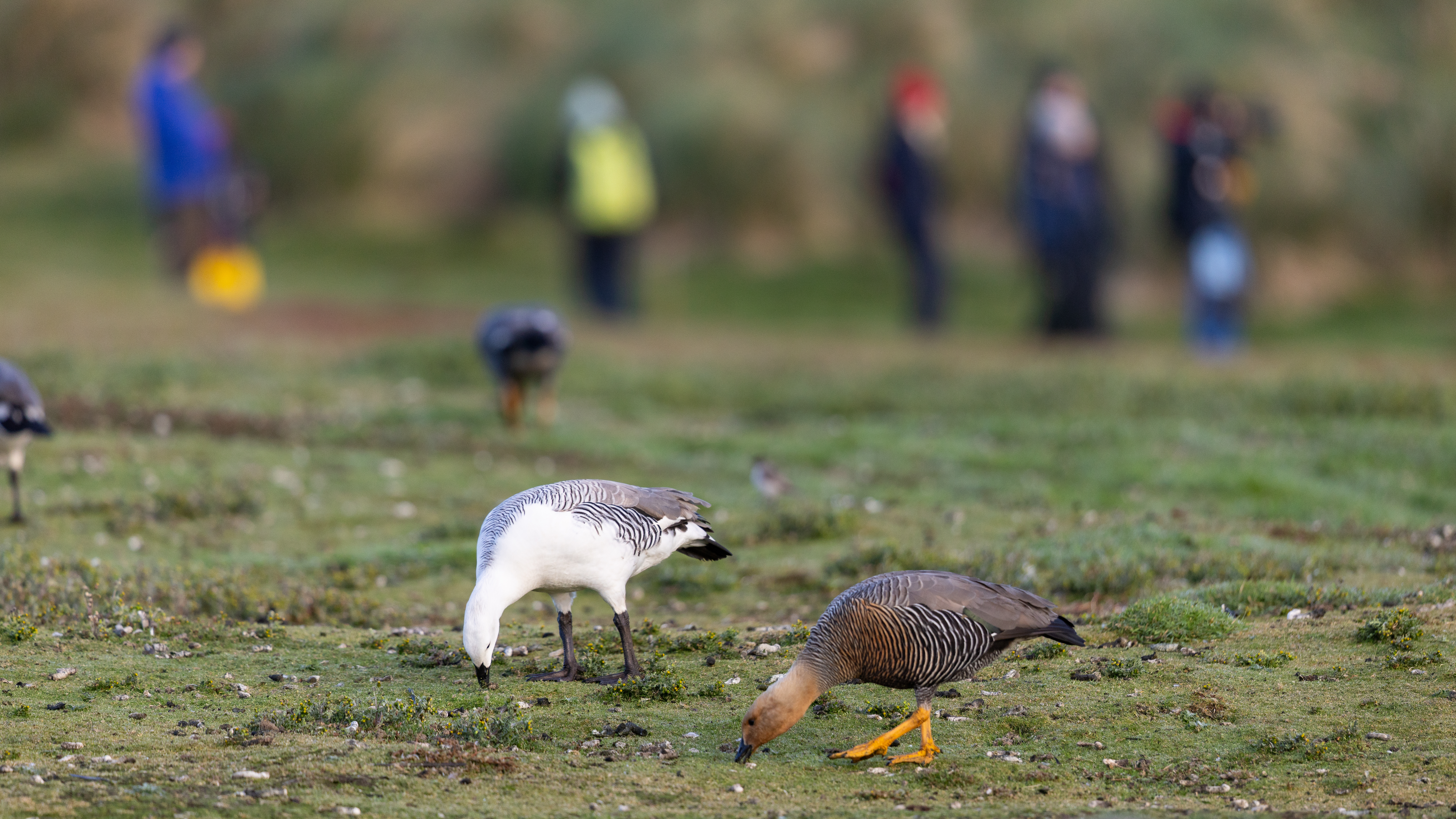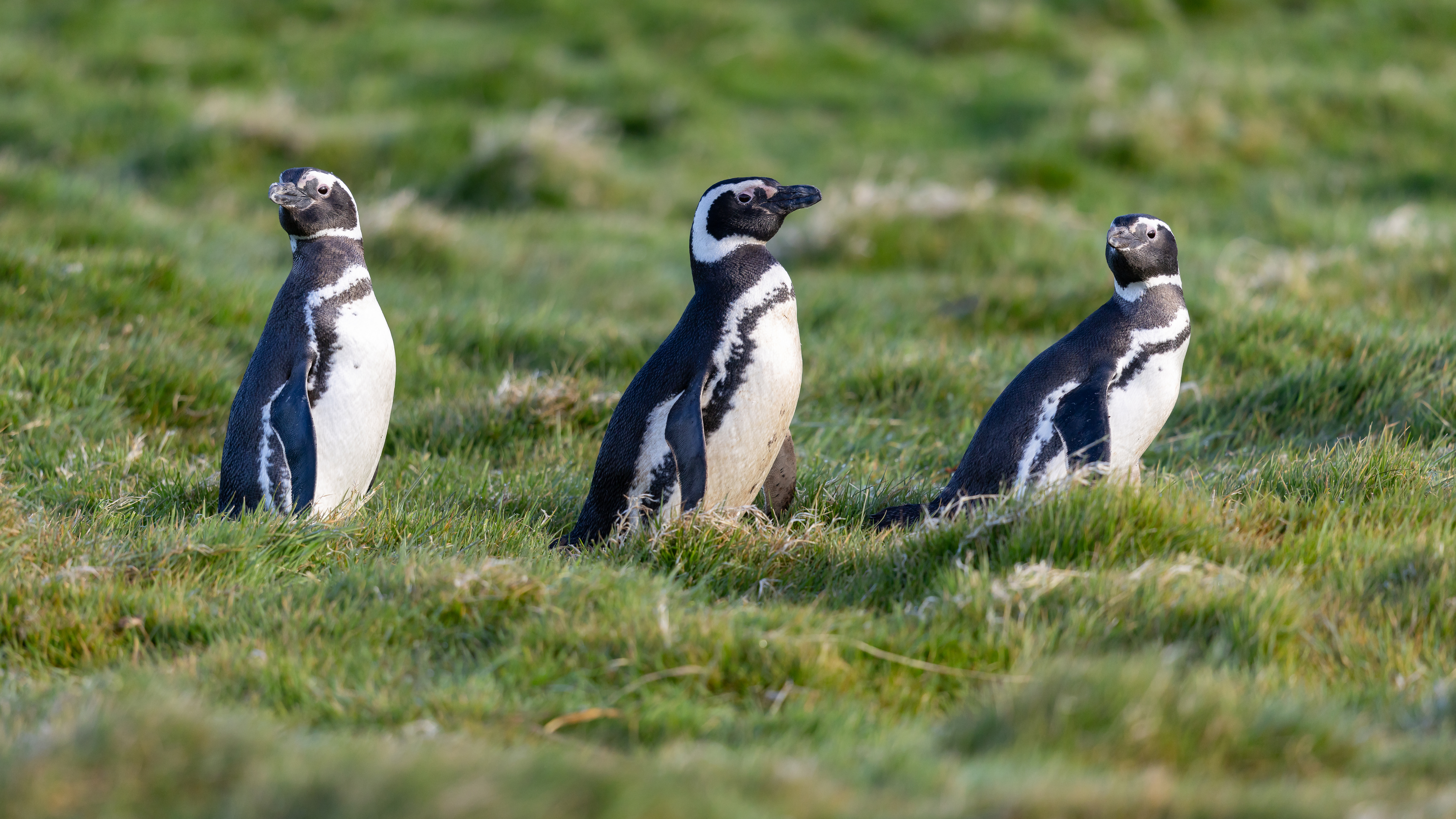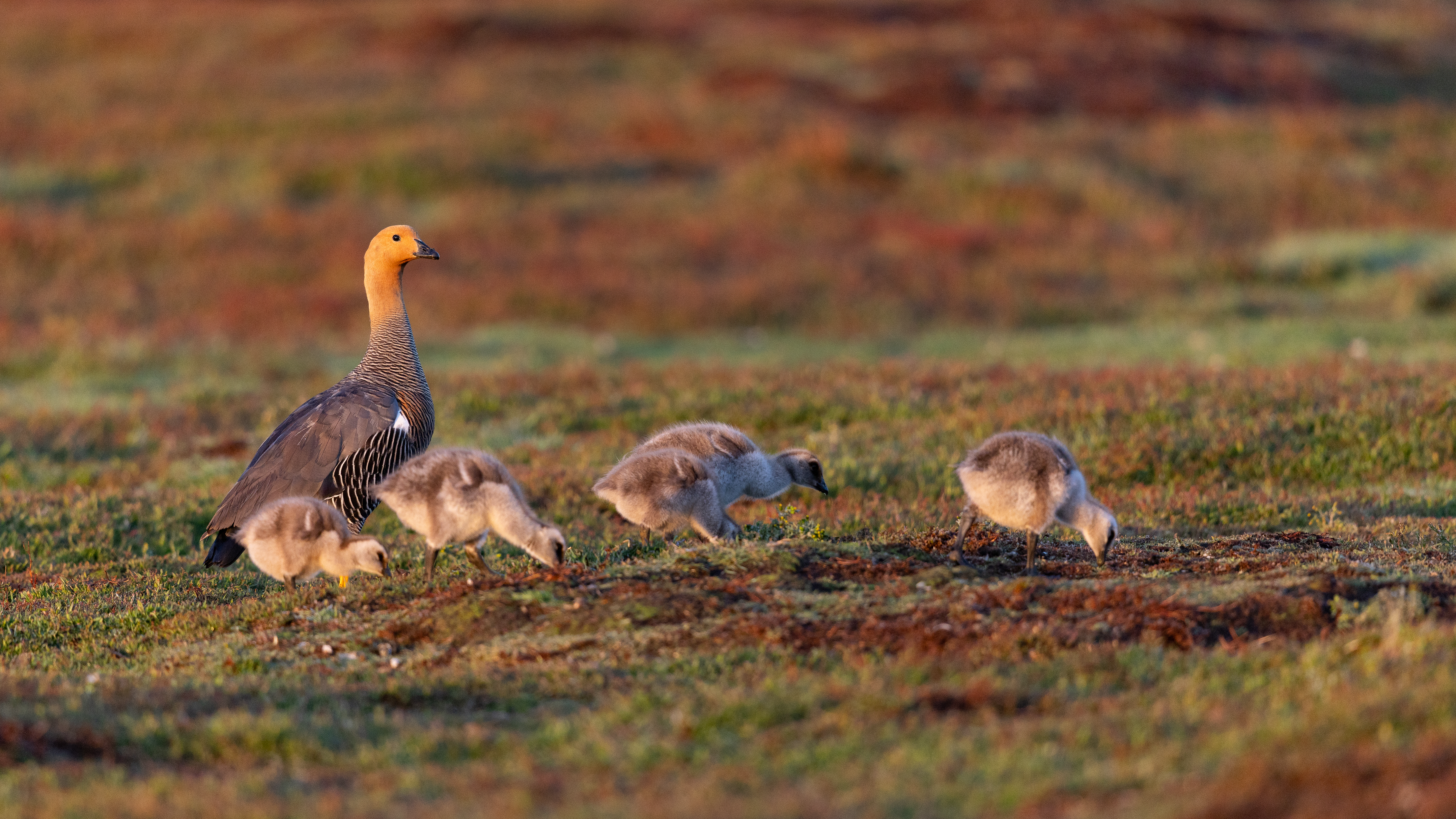 Vi landade på stranden, där vi redan kunde bevittna Falklandsöarnas rika fågelliv, från gentoopingviner som häckade på stranden till höglandsgäss som rörde sig genom tussockgräset och magellanpingviner som gömde sig i sina hålor. Vi tog oss upp från stranden till de gröna slätterna som täcker öns spets. För varje steg avslöjade en ny vinkel det rika fågellivet, och när solen bröt igenom horisonten gjorde det mjuka morgonljuset varje foto unikt.