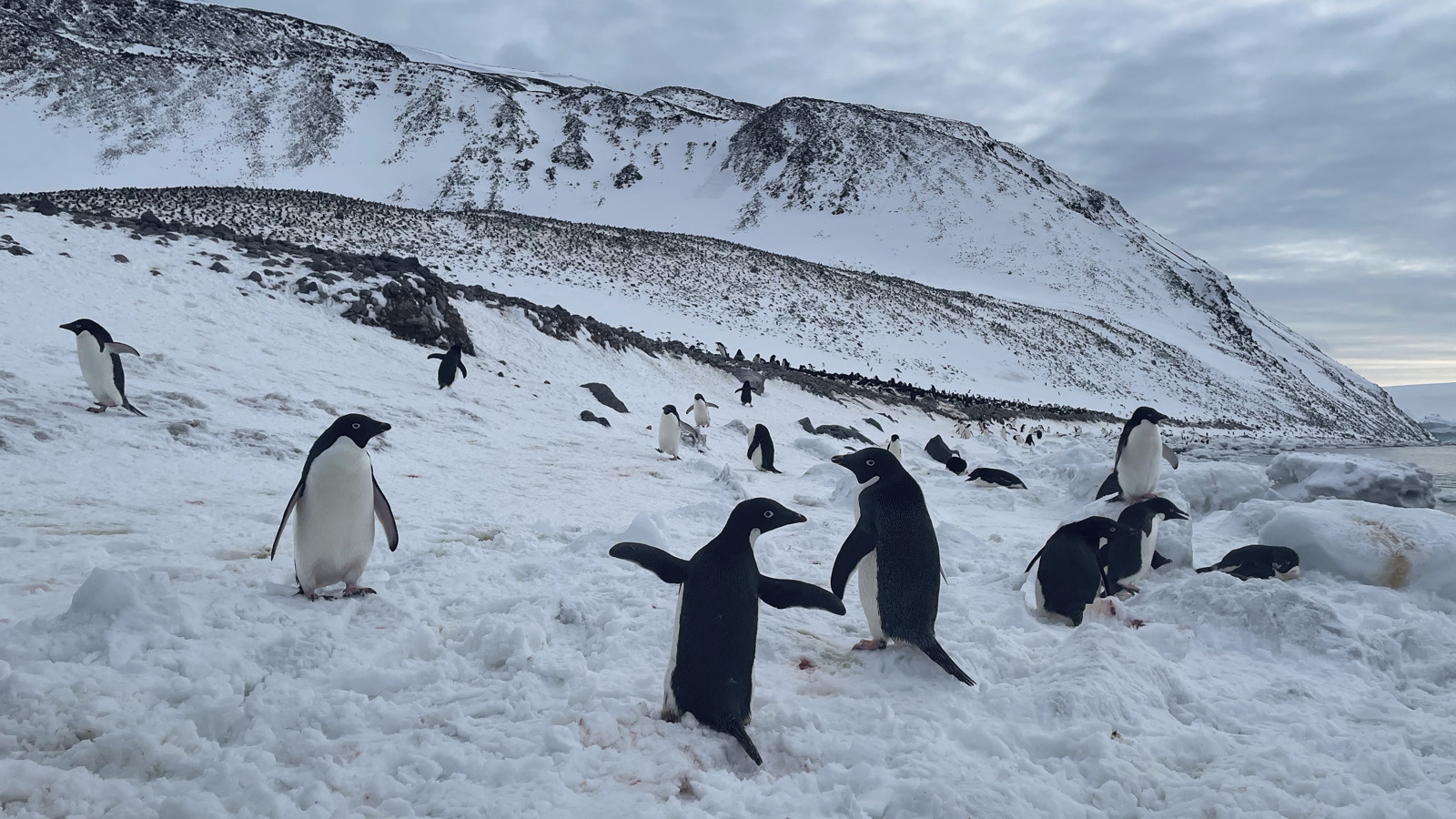 Om ni hör en variation av skrik, morrande och trumpetliknande ljud så kan det vara Adéliepingvinerna som kommunicerar med varandra.