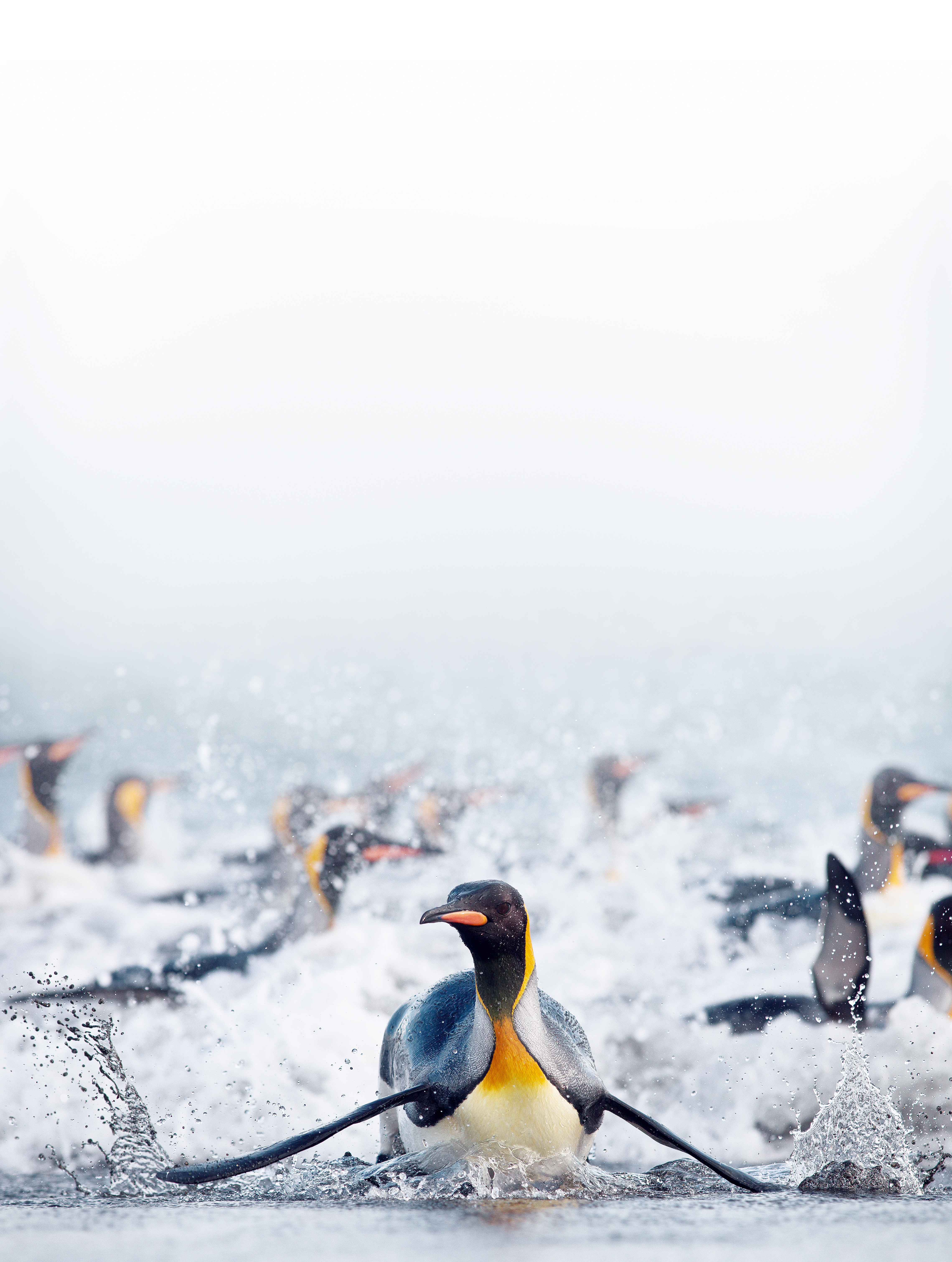 Kungspingviner är imponerande jägare under vattnet. De kan dyka till över 300 meters djup och stanna under ytan i mer än fem minuter när de jagar fisk och bläckfisk. Under jaktsäsongen kan kungspingviner tillbringa veckor ute på öppet hav, simma hundratals kilometer och nå områden med rik tillgång på föda långt från kolonin.