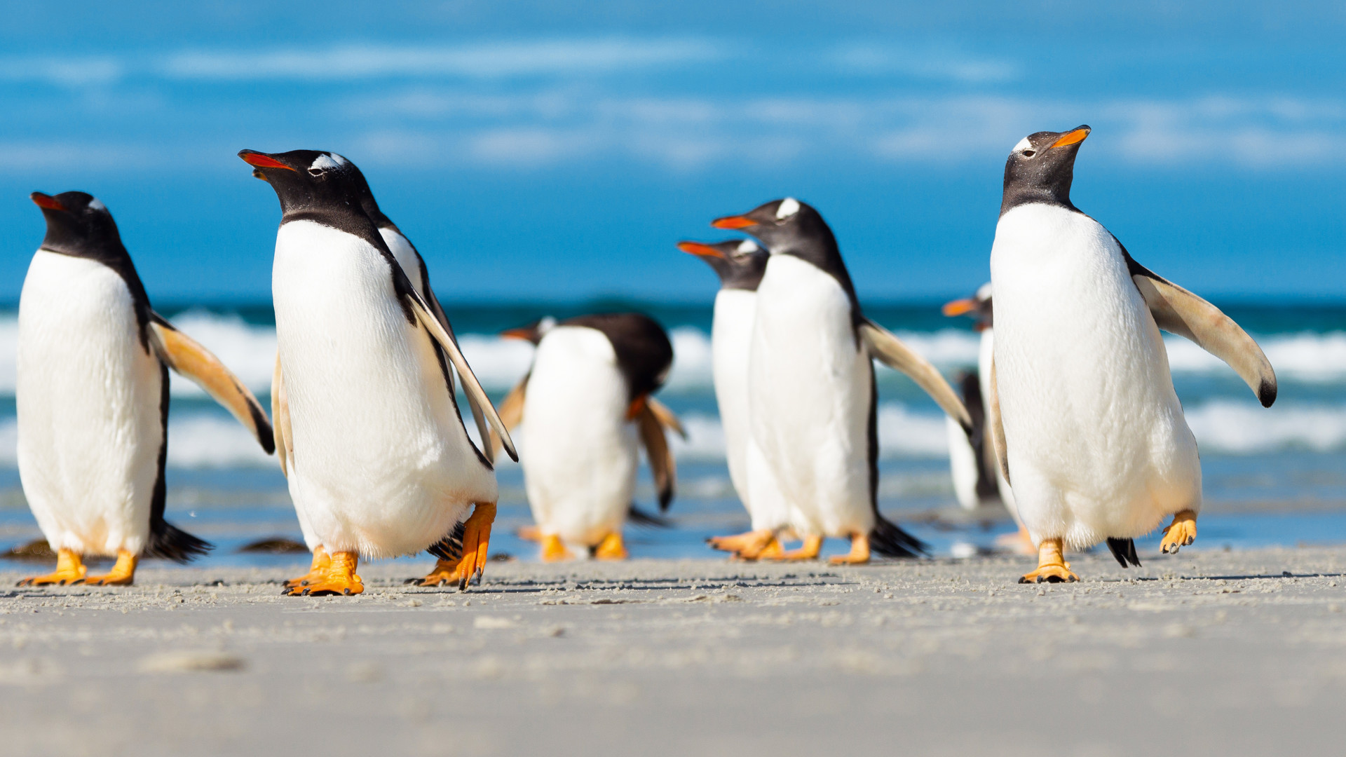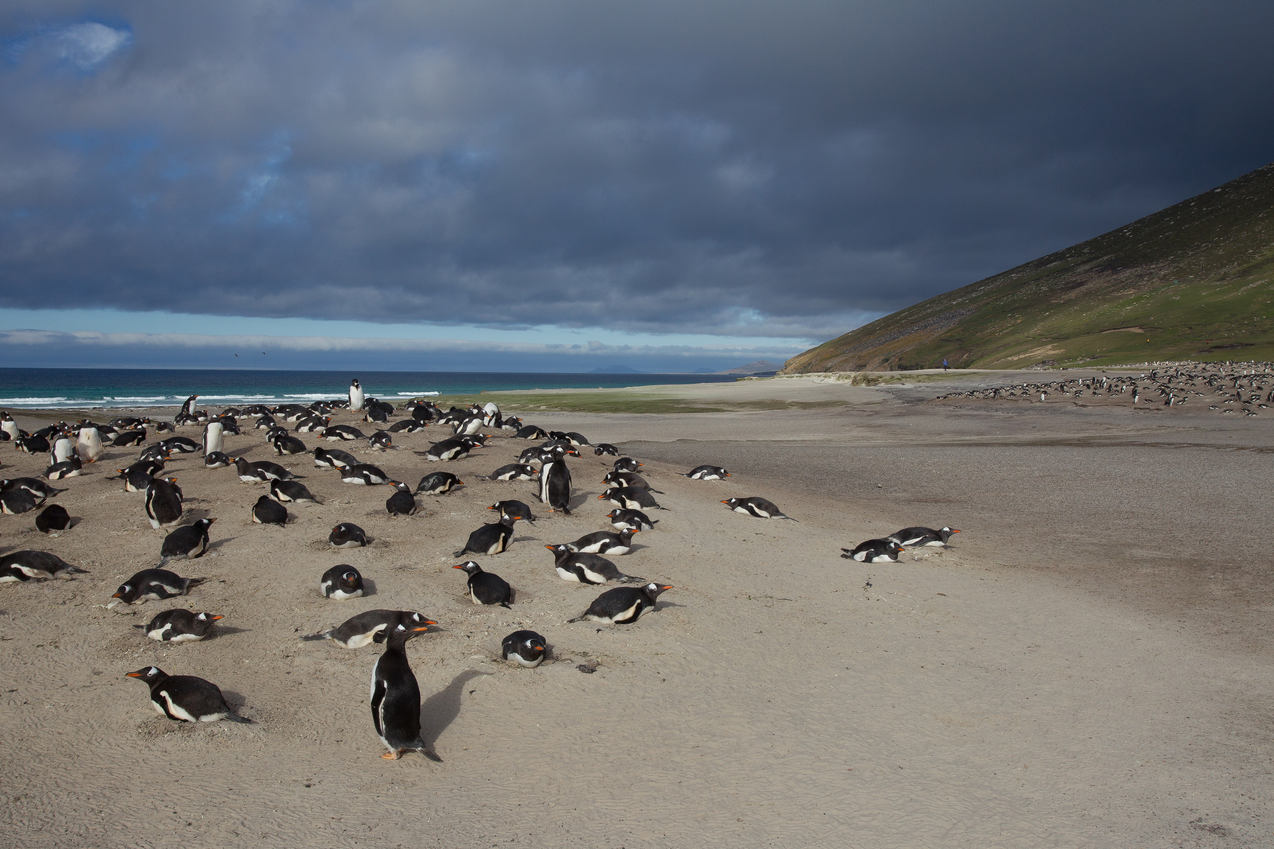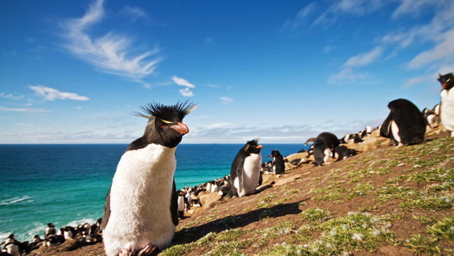 Falklandsöarna är berömda för sina pingvinkolonier, och du har chans att se flera arter under ditt besök här: Magellanpingviner som häckar i jordhålor likt kaniner, åsnepingviner som spatserar på stränderna och kaxiga klipphopparpingviner som hoppar jämfota framför benen på en när man går på gångarna bland det meterhöga tussockgräset. Har du tur kan du även skåda kolonier av de ståtliga kungspingvinerna.