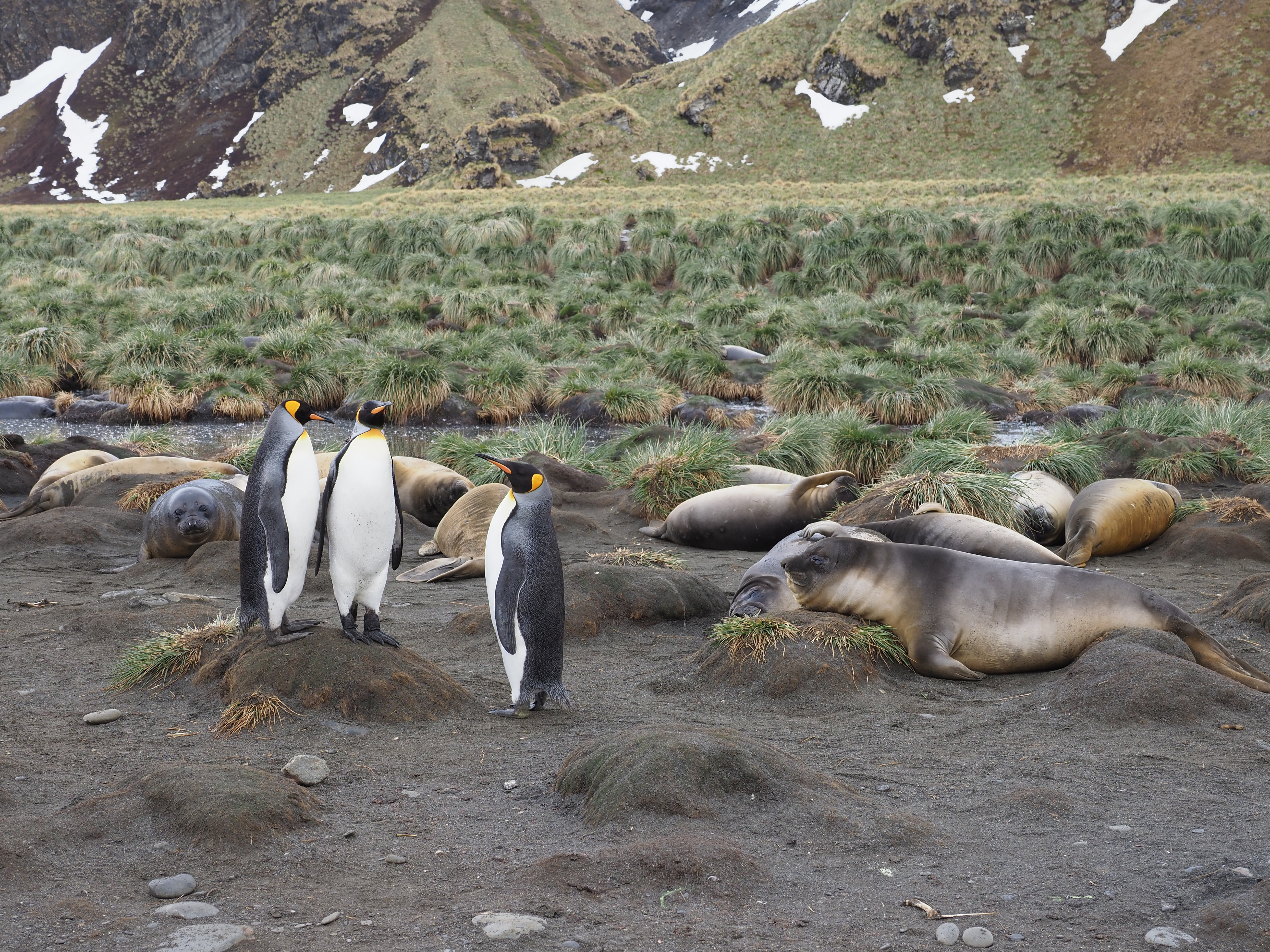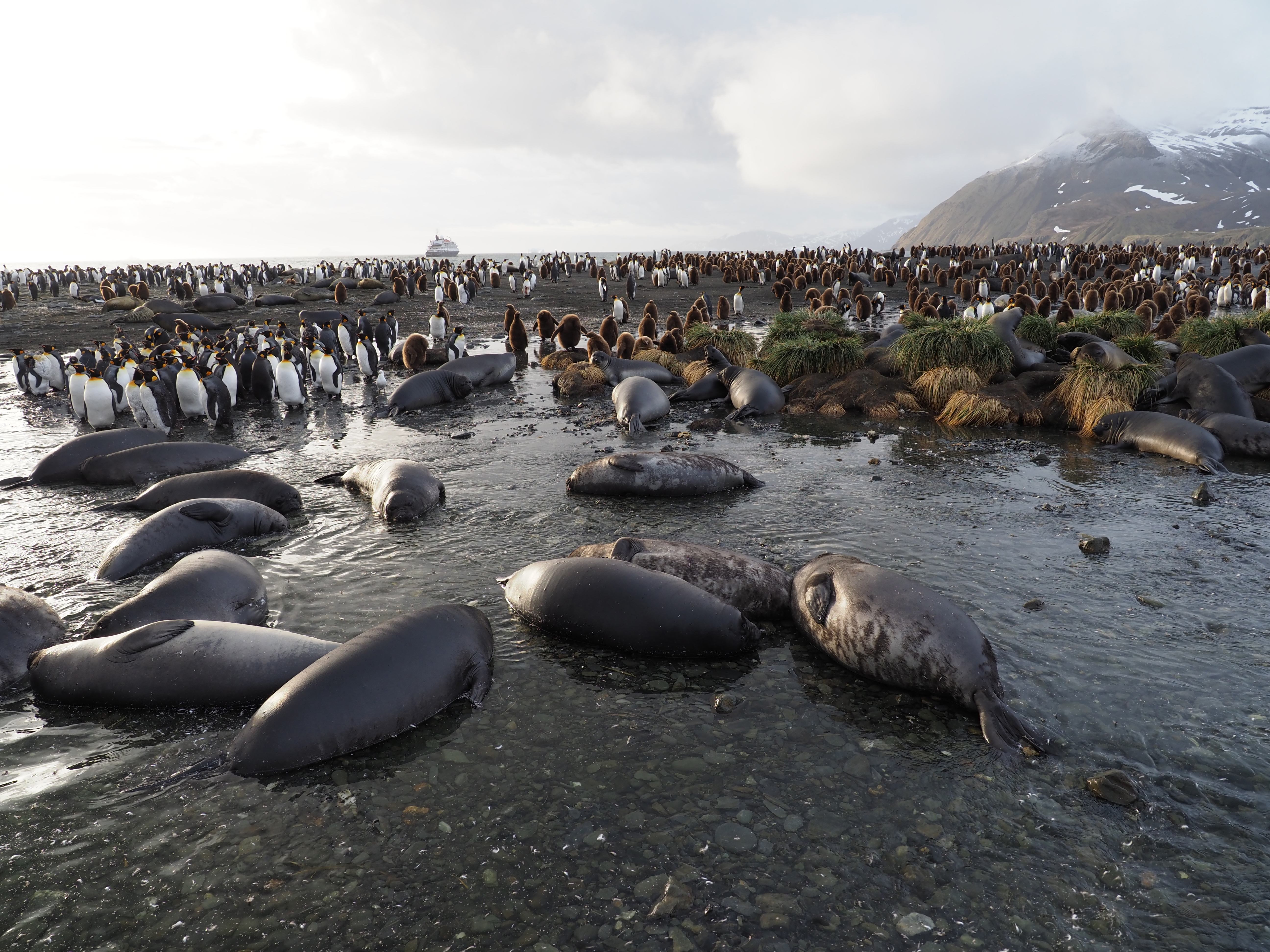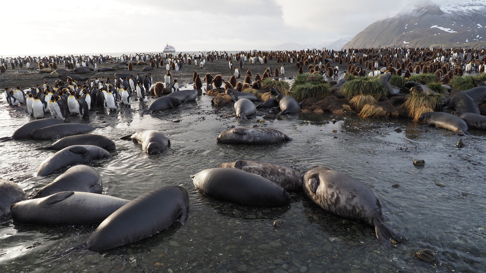Ljudet från vågorna drunknar i elefantsälarnas brummande, kungspingvinernas förtjusta tutande och pälssälarnas gnyende - det är ett sätt för dem att visa vart gränsen till deras revir går. När öronen väl vant sig vid alla ljuden börjar även ögonen arbeta. Vart jag än tittar är det hundratals kungspingviner som står i stora klungor eller som strosar runt. Elefantsälsungarna ligger som små klumpar överallt och söker ögonkontakt med sina stora, runda ögon. Plötsligt hör vi ett dunder och marken vibrerar något. Precis intill är det två elefantsälshannar som utmanar varandra och det blir haremslagsmål!