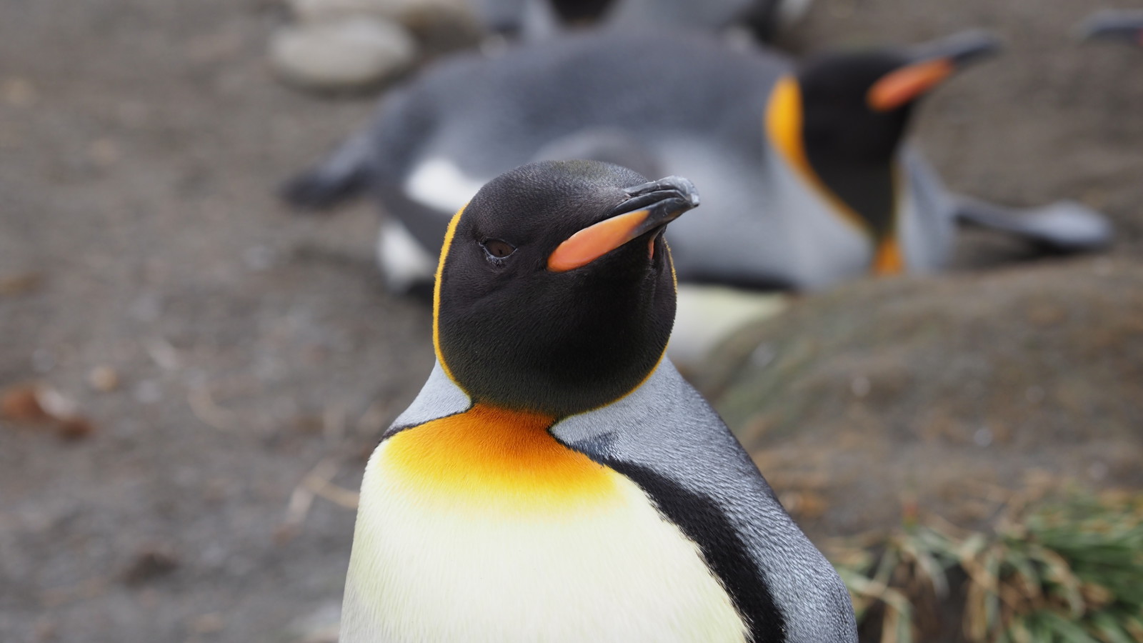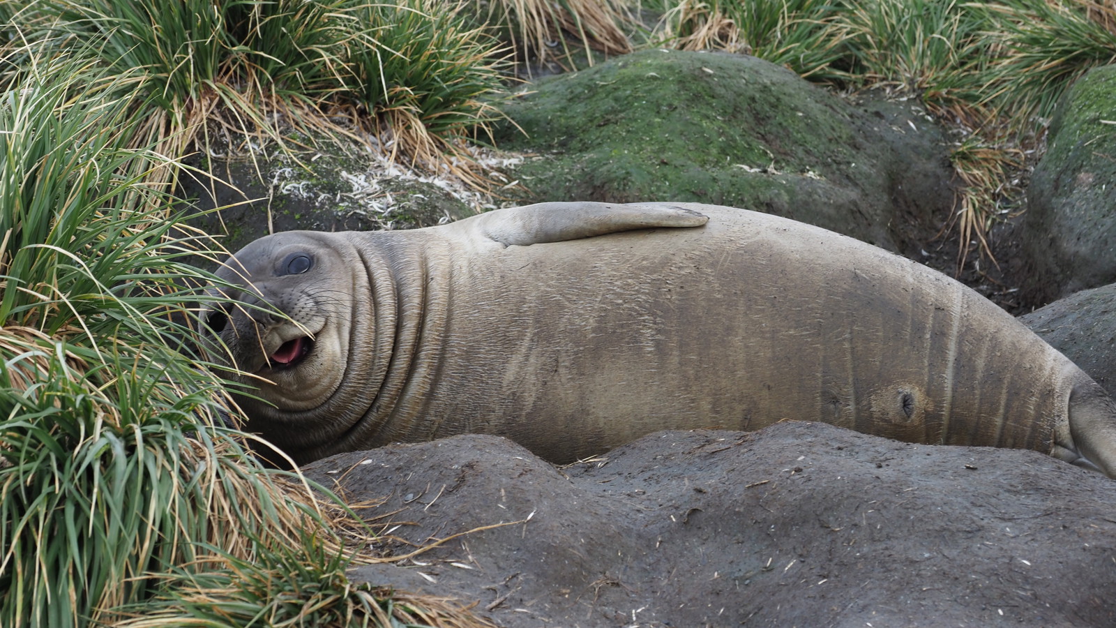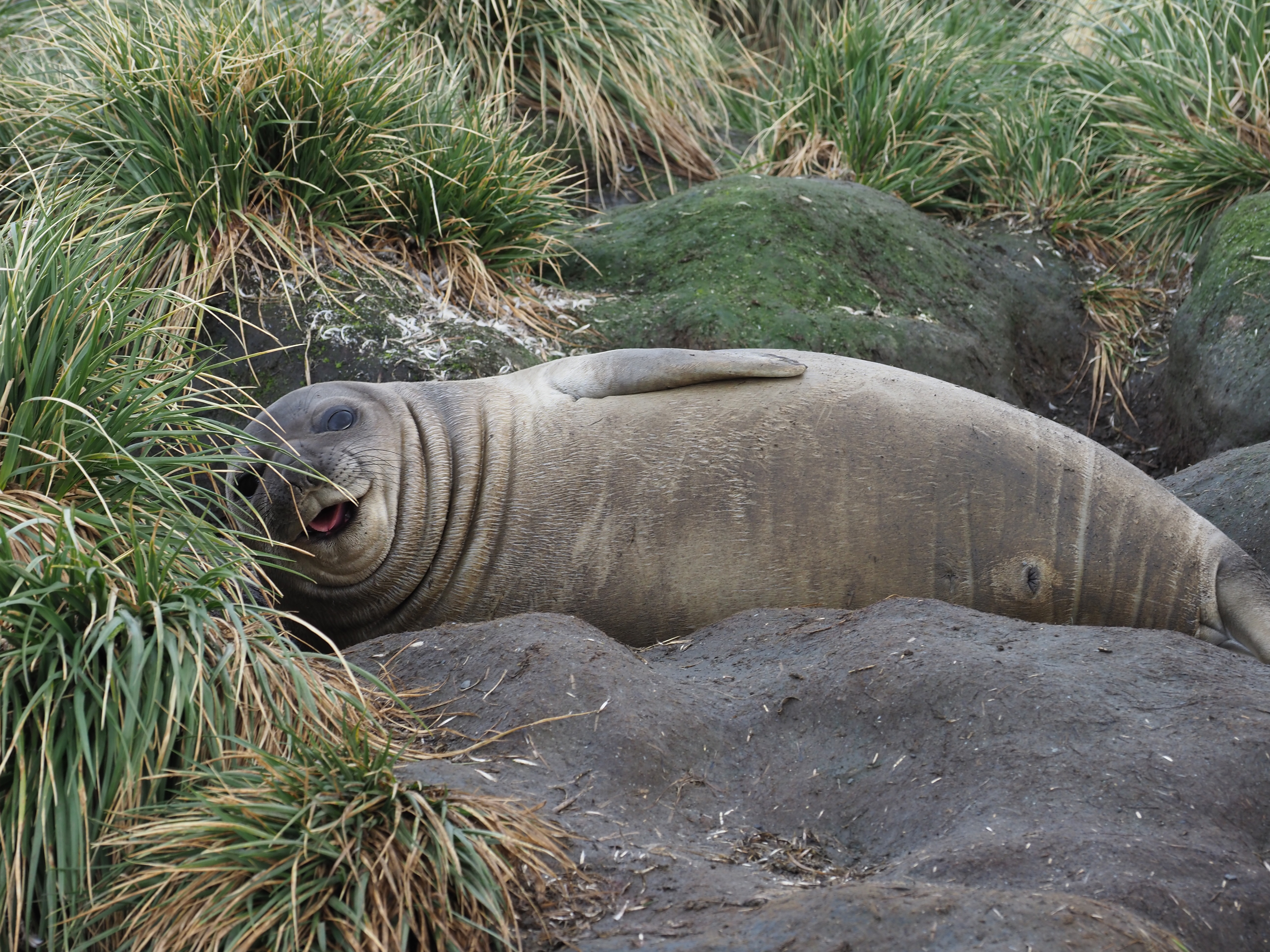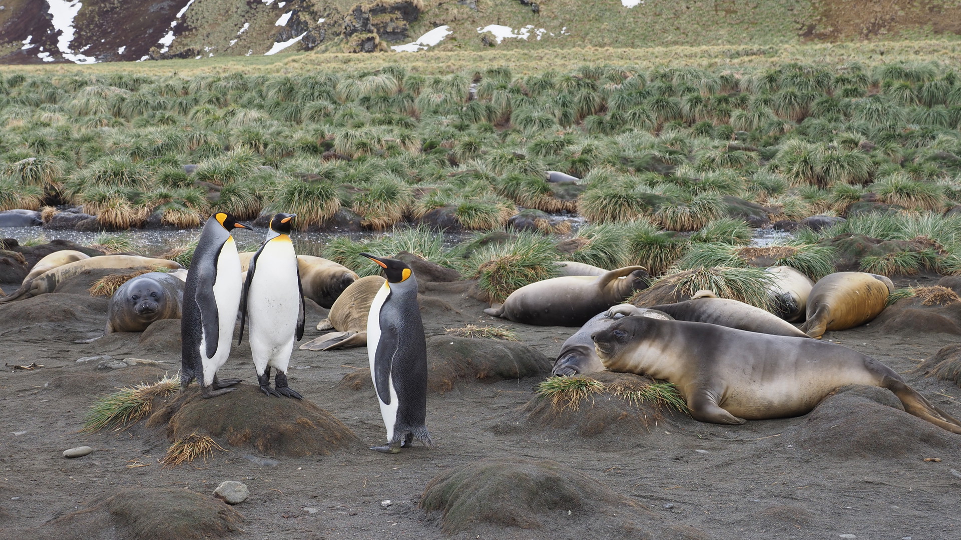 Ljudet från vågorna drunknar i elefantsälarnas brummande, kungspingvinernas förtjusta tutande och pälssälarnas gnyende - det är ett sätt för dem att visa vart gränsen till deras revir går. När öronen väl vant sig vid alla ljuden börjar även ögonen arbeta. Vart jag än tittar är det hundratals kungspingviner som står i stora klungor eller som strosar runt. Elefantsälsungarna ligger som små klumpar överallt och söker ögonkontakt med sina stora, runda ögon. Plötsligt hör vi ett dunder och marken vibrerar något. Precis intill är det två elefantsälshannar som utmanar varandra och det blir haremslagsmål!