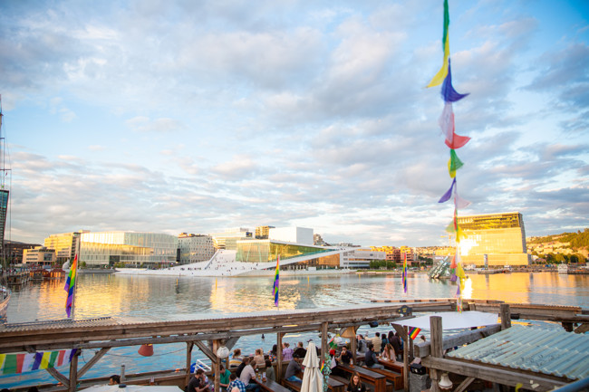 Med utsikt över Oslos berömda operahus ligger detta nomadiska konstprojekt. De pyramidformade träkonstruktionerna kallas hesjer och härstammar från traditionella byggmetoder längs den norska kusten. Här händer det saker året runt! Det finns sex bastur, ett flertal matstånd, barer både inomhus- och utomhus, flera scener och kulturprogram varje dag.