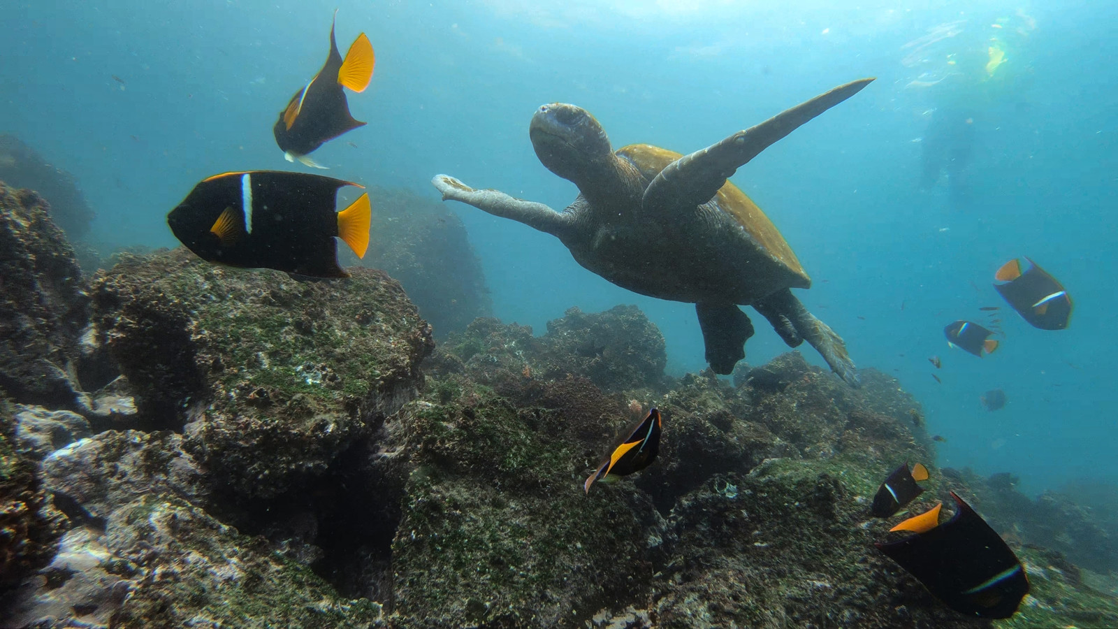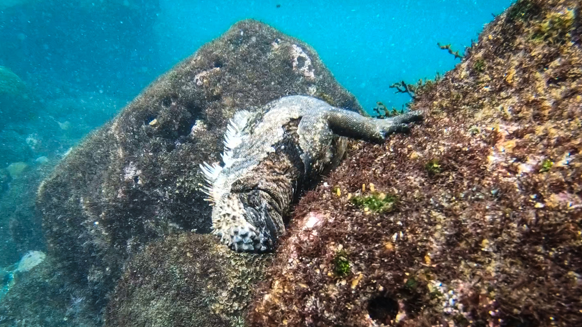 Därefter krängde vi på oss våtdräkterna och med snorkel och cyklop kunde vi nu utforska vad som dolde sig under ytan. Här simmade vi bland havssköldpaddor och allehanda färggranna fiskar i stora stim - vissa så kompakta att man inte såg botten under dem. Eftermiddagen bjöd på mer snorkling längs den yngre ön Fernandinas lavakust och här mötte vi havsleguanerna igen där de var upptagna med att beta alger från undervattensklipporna. Galapagos är det enda ställe i världen där man kan se ödlor hämta sin mat i havet.