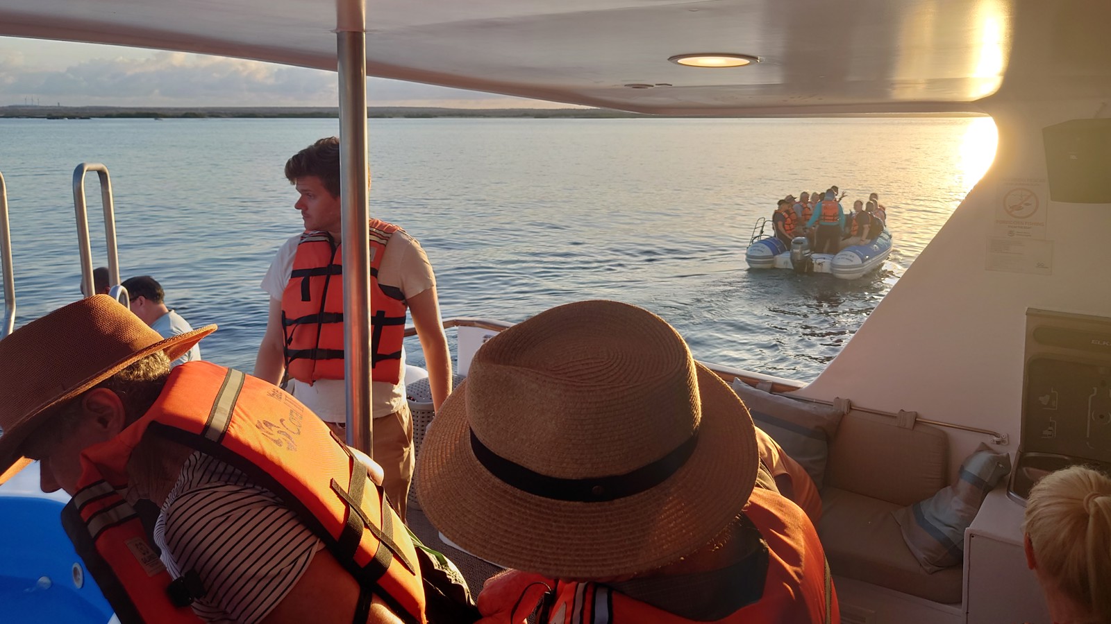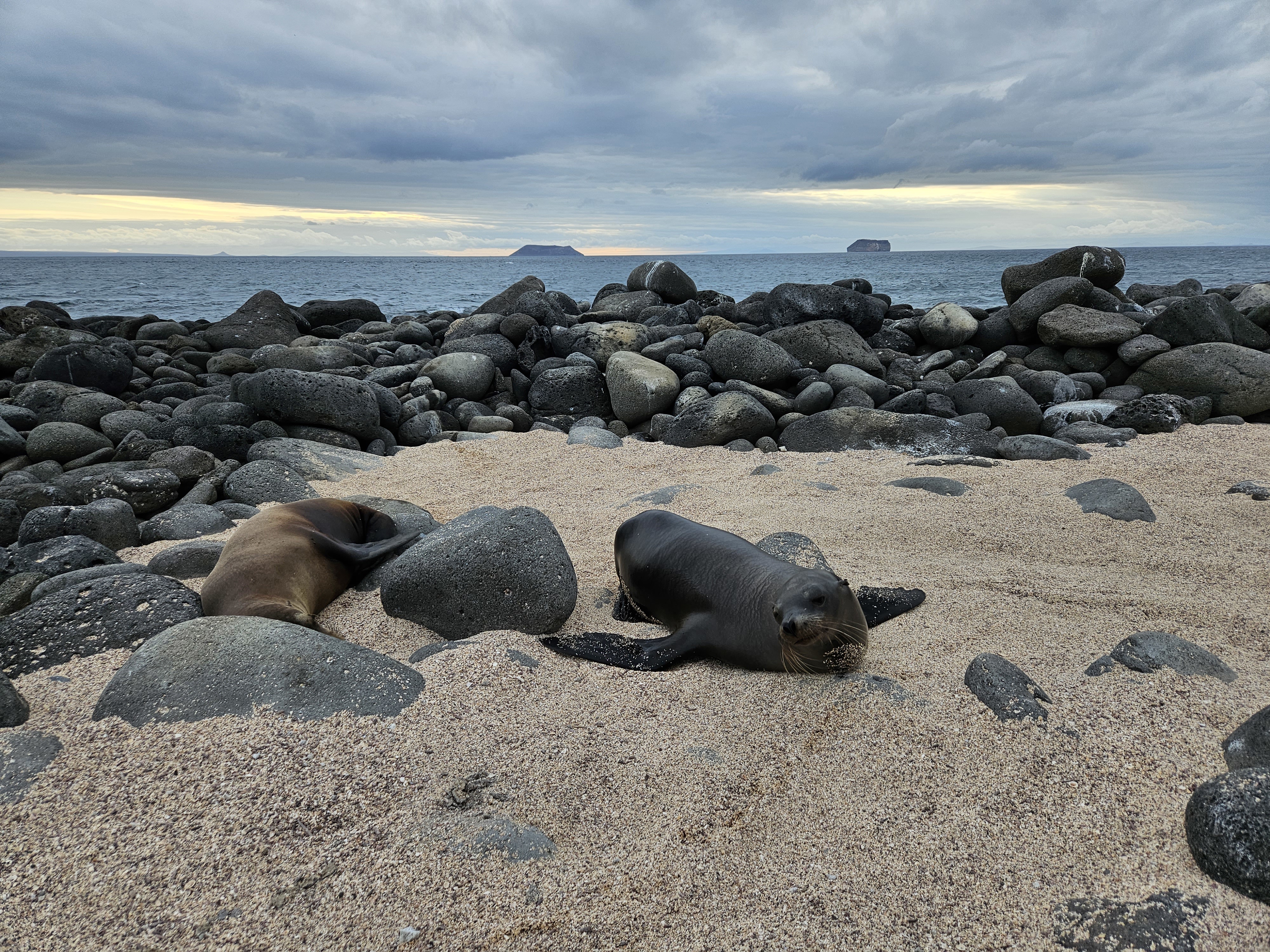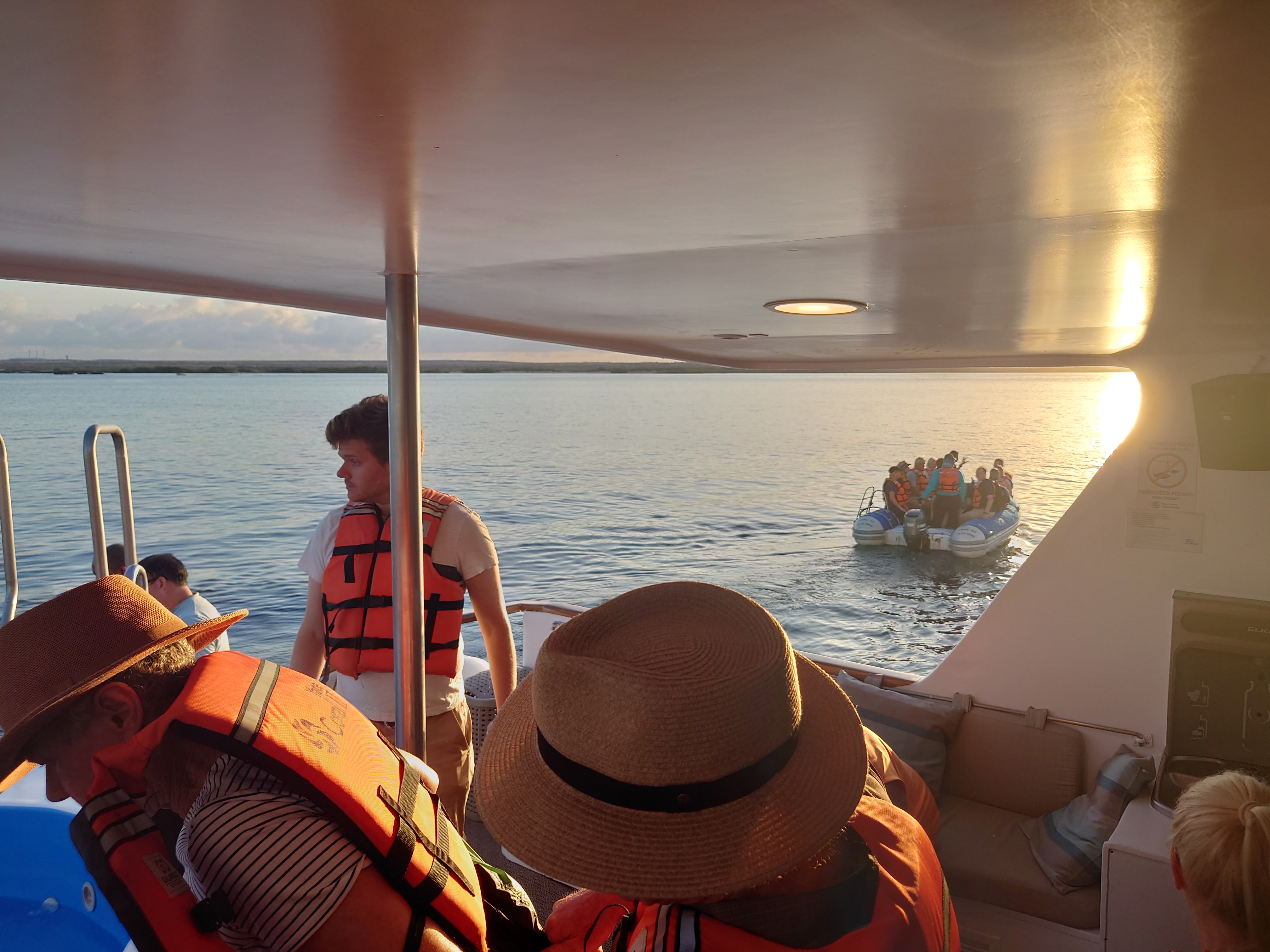 Vi vaknar tidigt för att åka till flygplatsen. Vid incheckningen går allt smidigt, och vi sätter oss på planet som tar oss till Baltra via Guayaquil. Planet är i tid och när vi anländer till Galapagos möts vi av våra guider Pedro och Monica. Vi tar bussen ner till hamnen och går ombord på våra två gummibåtar som tar oss till vårt hem för den kommande veckan, Coral II. Efter en god lunch ger vi oss ut till vår första destination, North Seymour, en fantastisk ö med massor av sjölejon, fregattfåglar, blåfotade sulor och mycket annat. Kvällsljuset är perfekt, och vi återvänder ombord precis vid solnedgången för att äta middag.