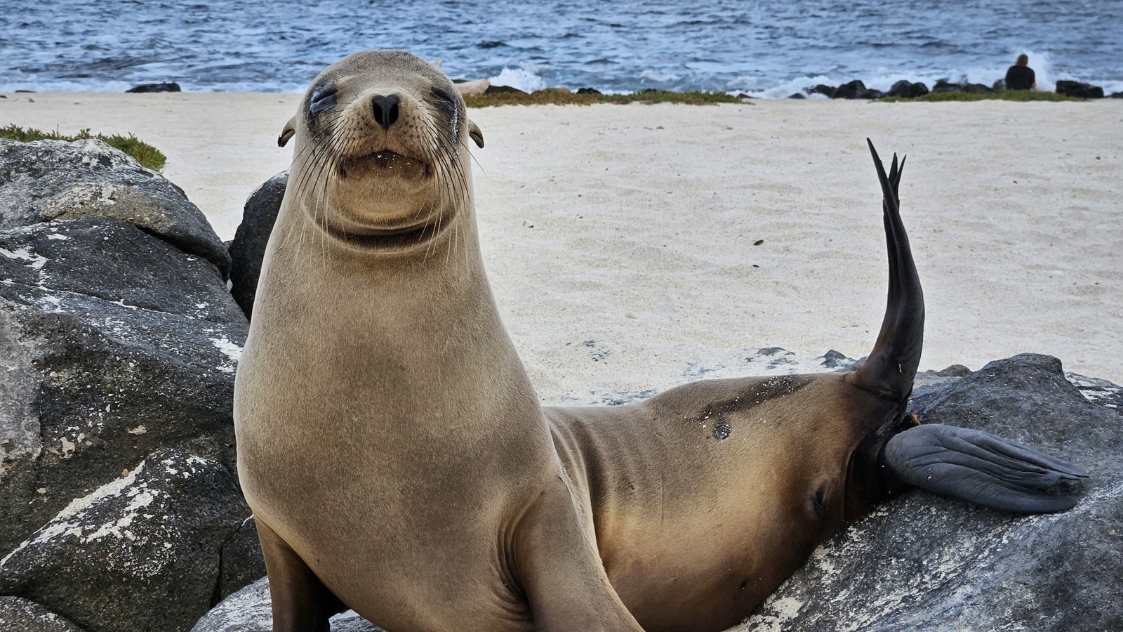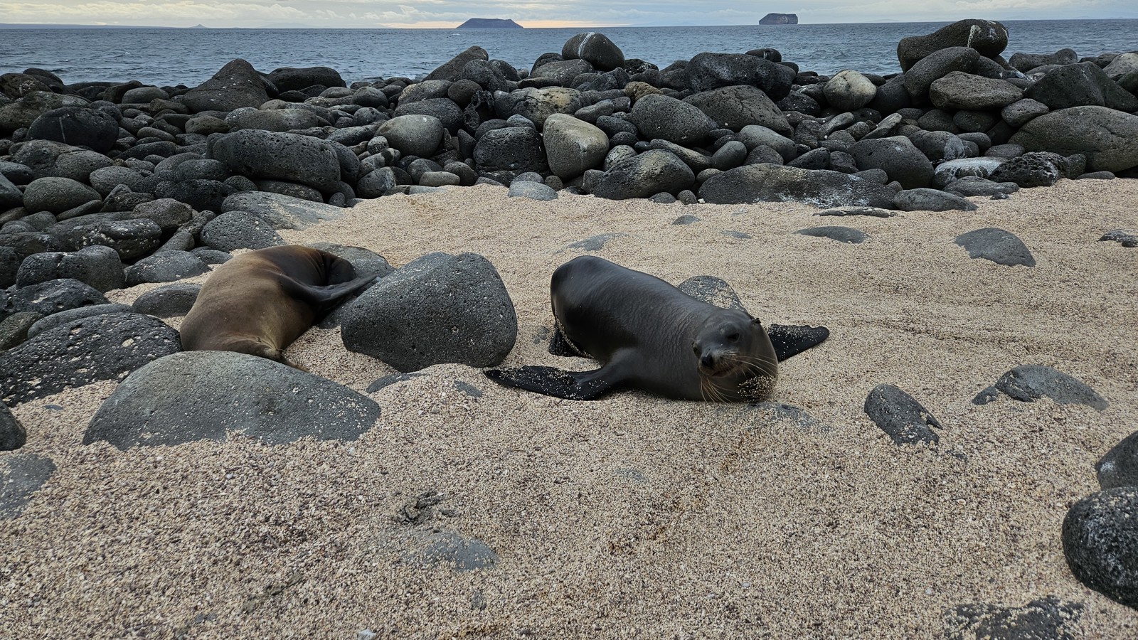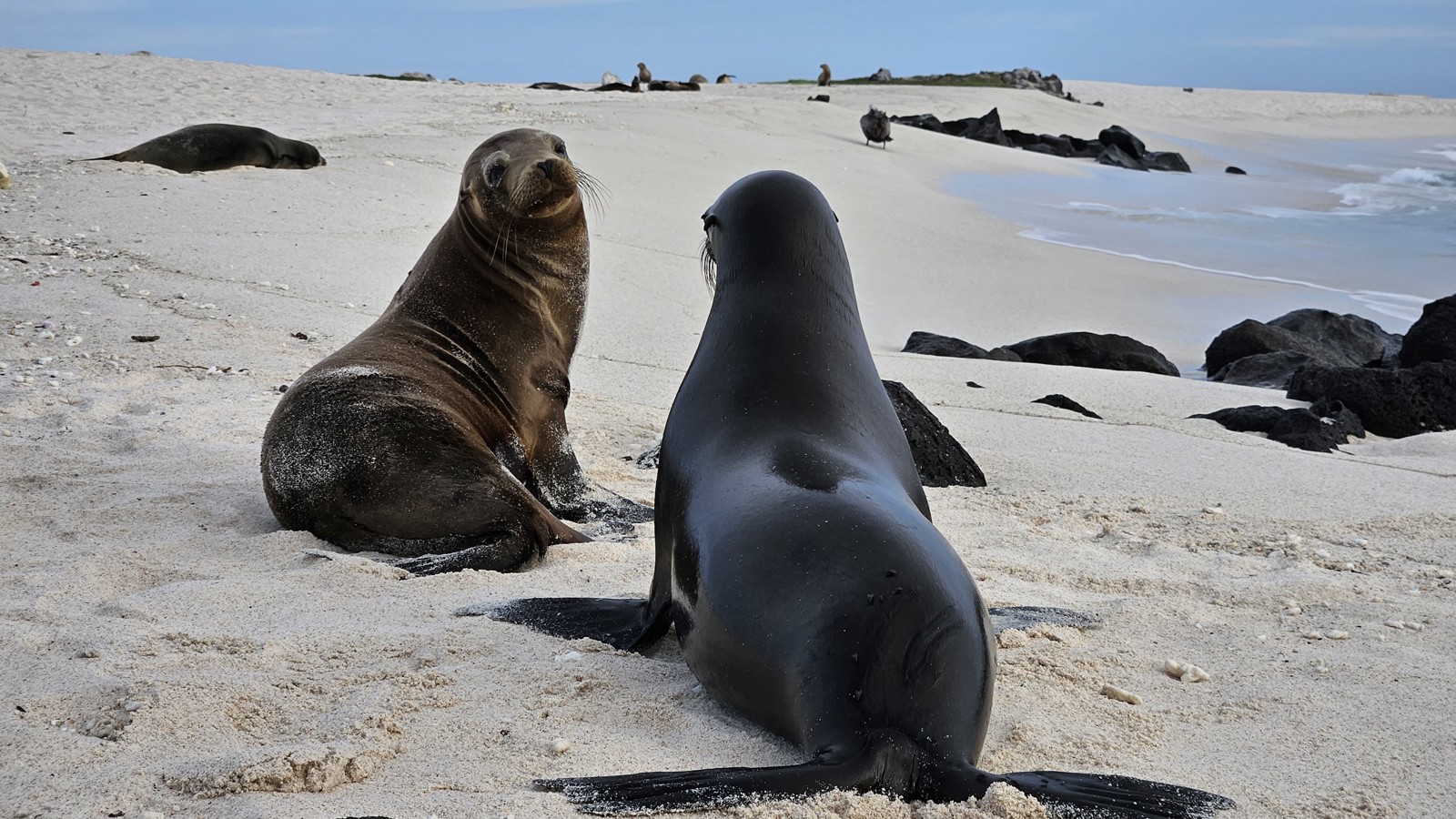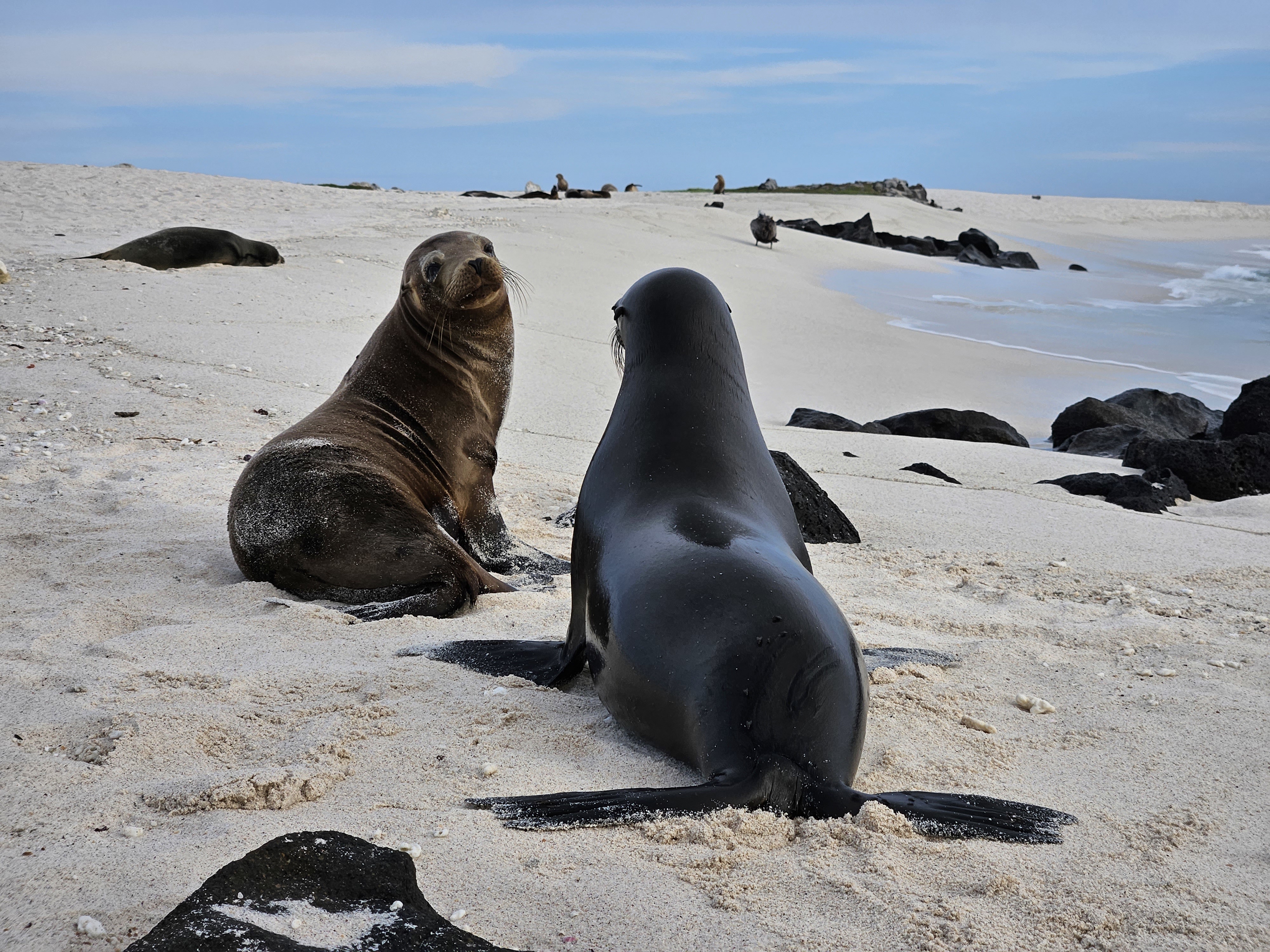 Vi vaknar tidigt för att åka till flygplatsen. Vid incheckningen går allt smidigt, och vi sätter oss på planet som tar oss till Baltra via Guayaquil. Planet är i tid och när vi anländer till Galapagos möts vi av våra guider Pedro och Monica. Vi tar bussen ner till hamnen och går ombord på våra två gummibåtar som tar oss till vårt hem för den kommande veckan, Coral II. Efter en god lunch ger vi oss ut till vår första destination, North Seymour, en fantastisk ö med massor av sjölejon, fregattfåglar, blåfotade sulor och mycket annat. Kvällsljuset är perfekt, och vi återvänder ombord precis vid solnedgången för att äta middag.