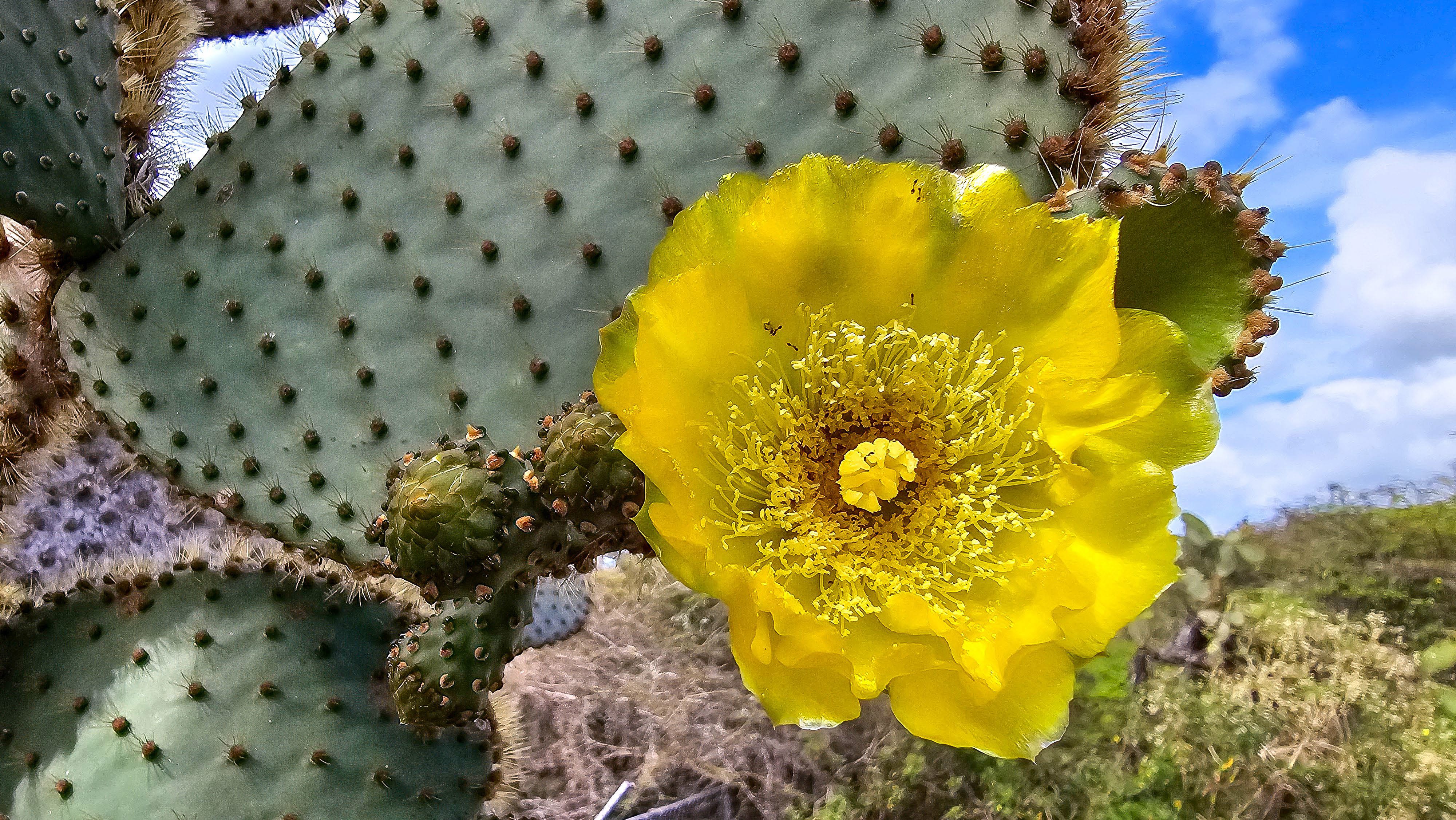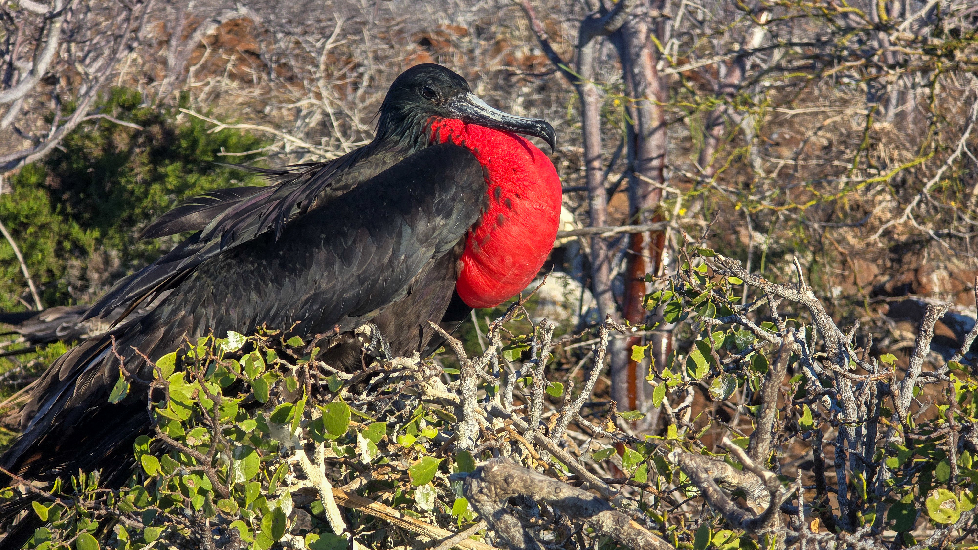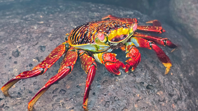 Vid landningsplatsen möts vi av Sally Lightfoot-krabbor – dessa typiskt röda krabbor som verkligen lyser mot de svarta lavastenarna. Under vandringen ser vi landleguaner, blåfotade sulor, fregattfåglar med sina röda ballonger och sjölejon.