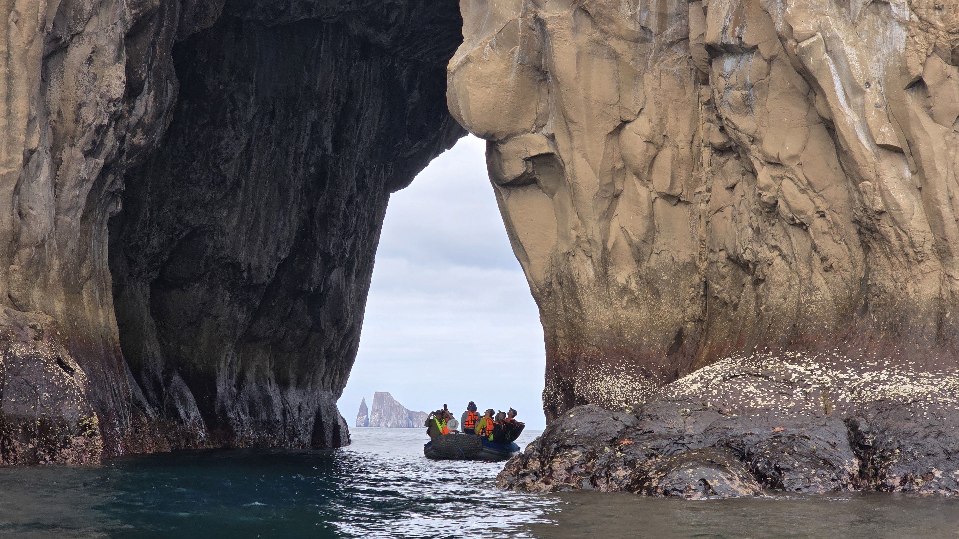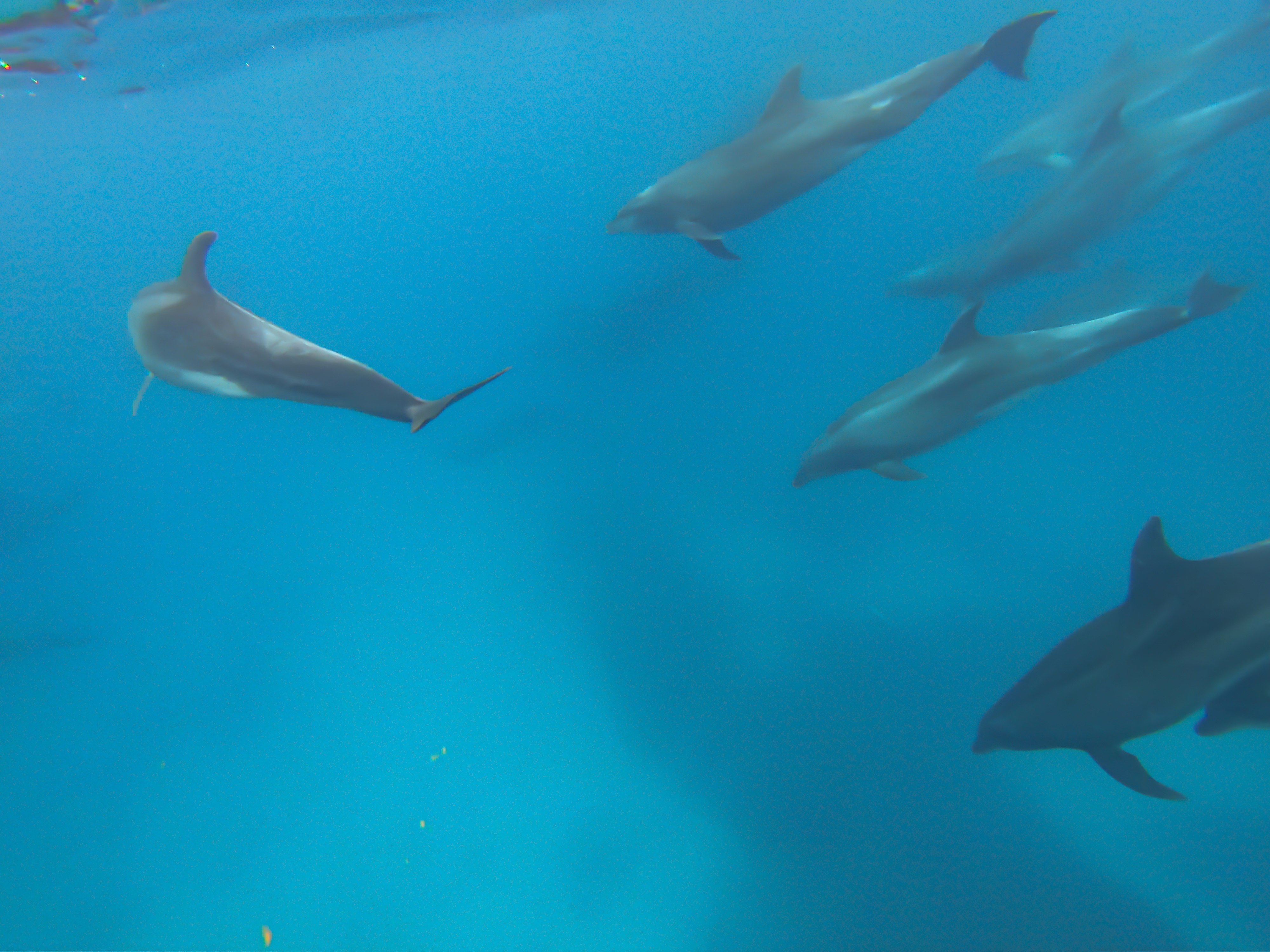 Lite kalla när vi kom tillbaka till båten, hann vi knappt klä oss innan vi hoppade i zodiakerna igen. Plötsligt närmar sig över 300 flasknosdelfiner, och vi följer dem medan de leker runt oss och surfar på vågorna från våra zodiaker. Det blev ett oförglömligt möte för alla, och efter landningen bubblar samtalen medan leenden når från öra till öra på samtliga expeditionsmedlemmar.