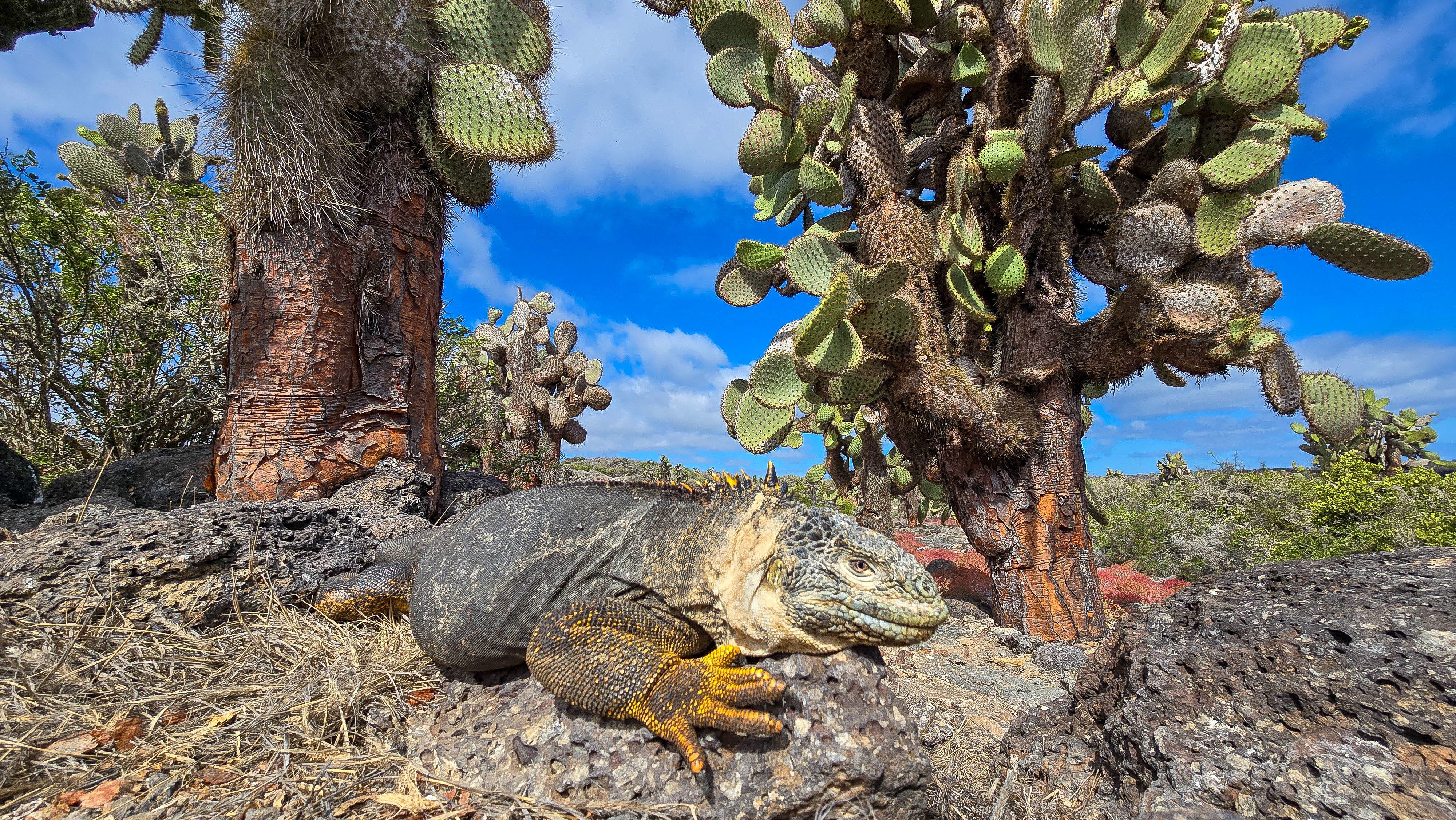 Då har vi landat på Galapagos! Vi går av planet på Baltra flygplats och börjar vår vandring mot terminalen, en promenad på kanske 200 meter. Innan vi ens har nått fram möts vi av en stor landleguan. Direkt efter att vi har plockat upp vårt bagage träffar vi våra lokala guider och hoppar på en buss ner till den närmaste piren. Därifrån tar vi en cirka 10 minuters Zodiactur ut till vårt fartyg, Coral II.