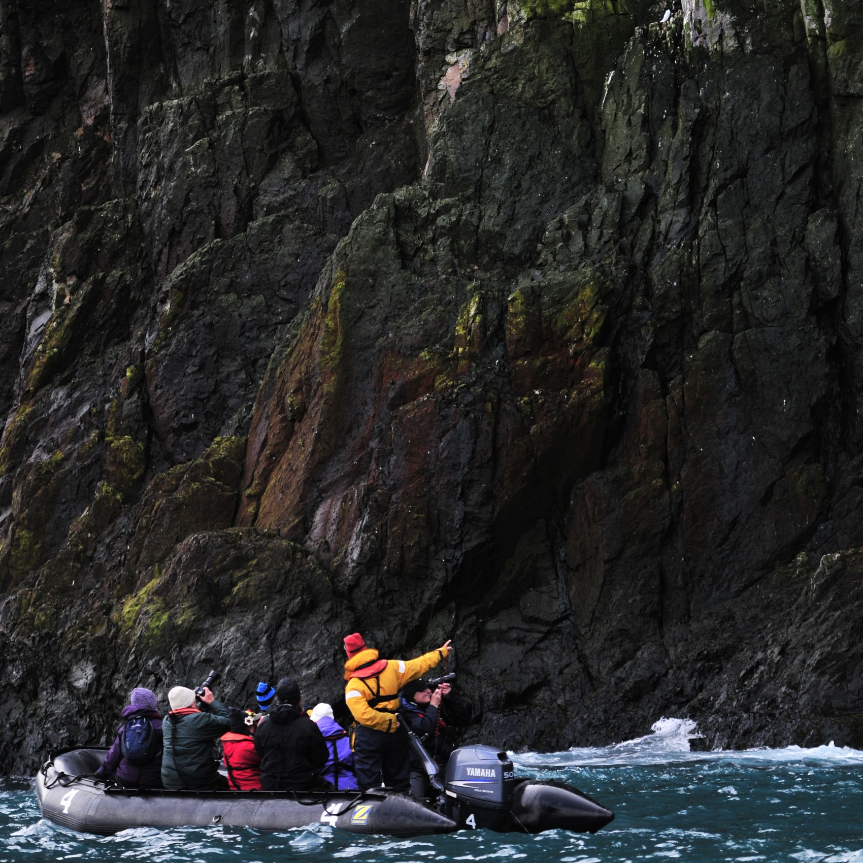 Vi rundade Björnöns sydspets och fortsatte vår färd upp till den norra delen av ön där vi besökte den metrologiska stationen från 1947. Den är bemannad av nio personer året runt, som byts av efter sex månader. På eftermiddagen ankrade vi i Kvalrossbukta där vi begav oss ut på en Zodiac-kryss vid Sørkapp. Vi kryssade långsamt längs med de hisnande, näst intill horisontala klippväggarna och var ackompanjerade till ljudet av hundratusentals häckande fåglar.