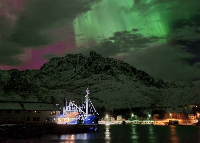 Natten sänkte sig över oss. M/S Stockholm låg vid piren i den lilla byn Sør-Tverrfjord. Efter att ha strosat runt i det lugna lilla samhället satt gästerna bekvämt tillbakalutade i den pittoreska salongen ombord.