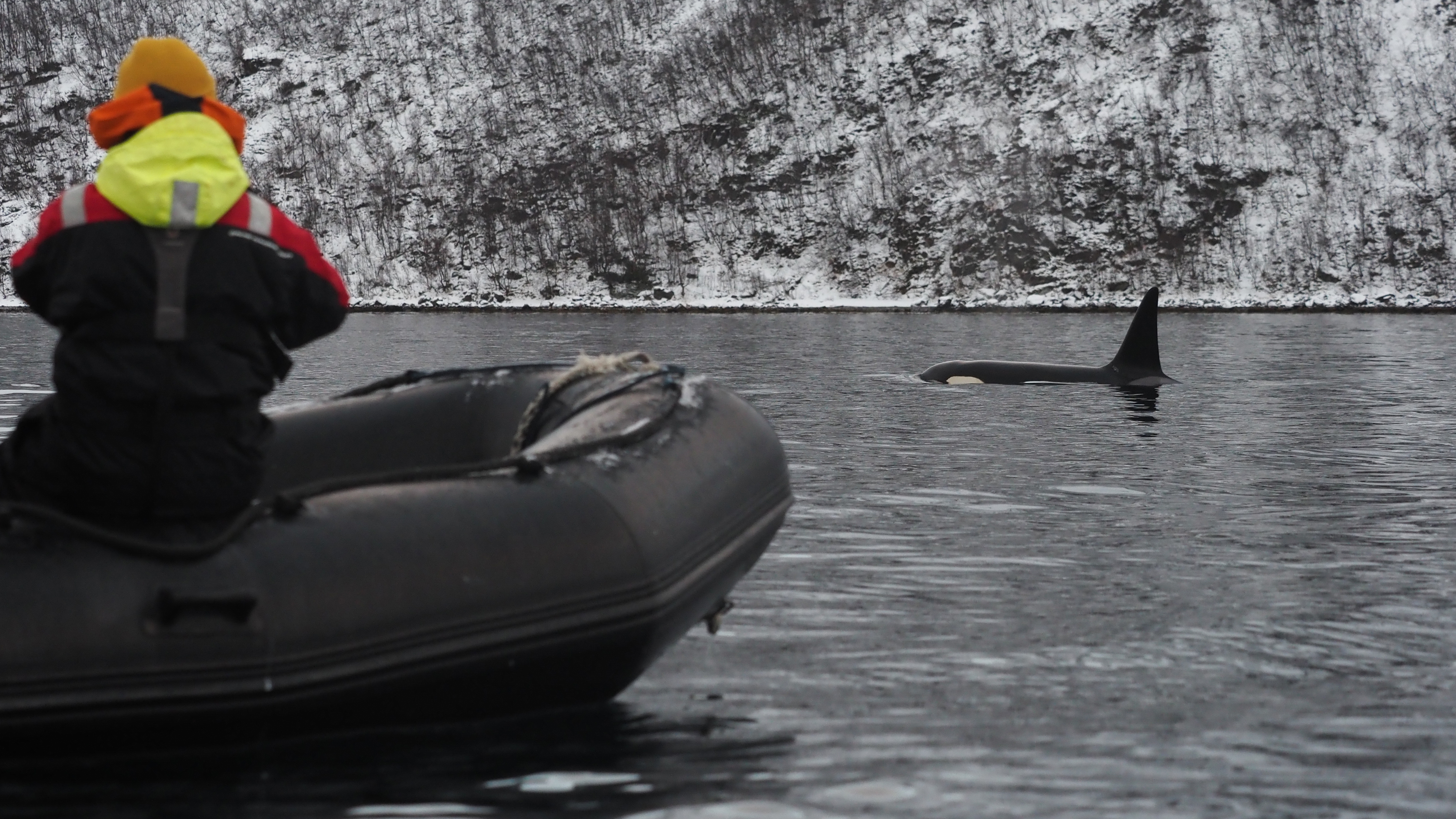 När de två gummibåtarna styrde ut i tandem sågs en frenesi av måsar på avstånd, ovanför en kokande röra av späckhuggarfenor.