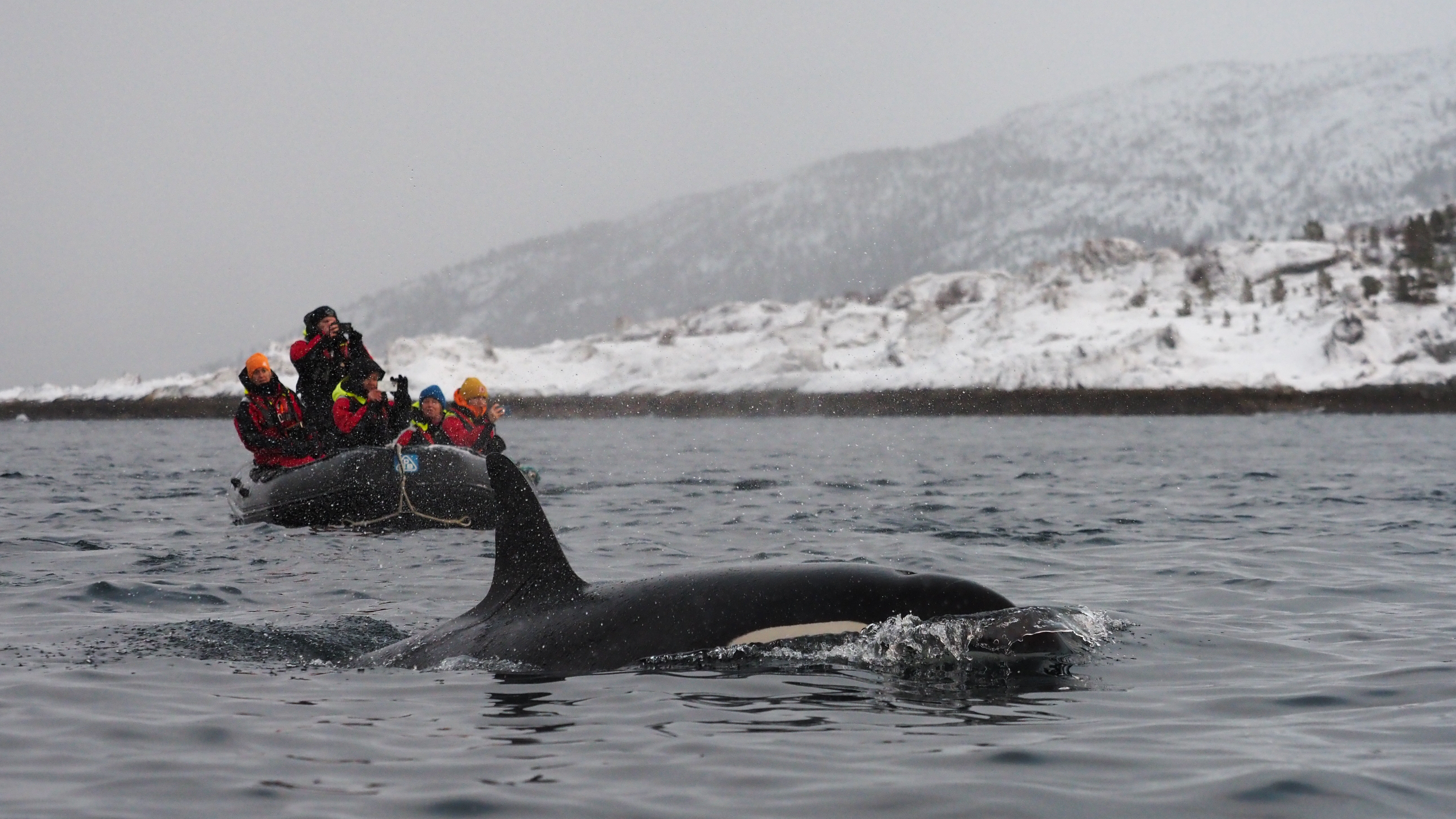 Späckhuggarna simmade till vänster, höger och mellan gummibåtarna och åt en procentandel av de 70 kilo sill per dag som behövs för att försörja en så stor massa av hjärna och muskler.