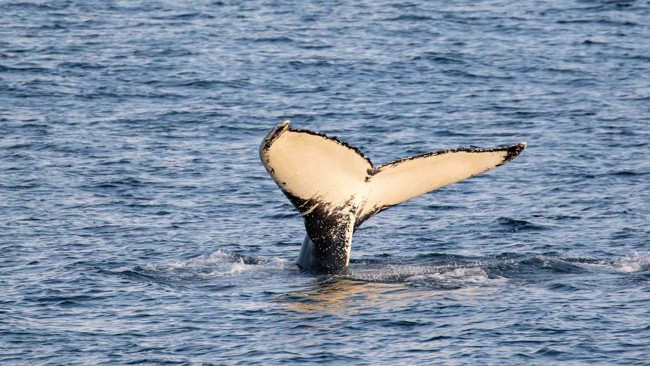 Nöjda med vår tur hoppade vi i Zodiacerna och tog oss tillbaka till fartyget. Lagom till det att vi tog kaffe i loungen dök våra första vilda vänner upp för att göra oss sällskap. Det var ett femtiotal tumlare! De for runt fartyget och följde oss en bra stund innan det blev stilla i vattnet igen, i alla fall för en liten stund… Efter showen de bjudit på höll en av våra guider, Magnus, ett föredrag om just tumlare. Han hann dock inte prata till punkt, för snart blev det rörelse både på fartyget och i vattnet då det hade siktats knölval från bryggan! Från däck kunde vi se hur tre knölvalar blåste vatten och visade upp sina vita stjärtfenor för oss. Vilken fantastisk eftermiddag! Jag kunde inte låta bli att känna mig lite extra glad i hjärtat efter att ha fått en tur i vackert landskap och dessutom fått se val. Fjordarna i Nordnorge gör ingen besviken en dag som denna!