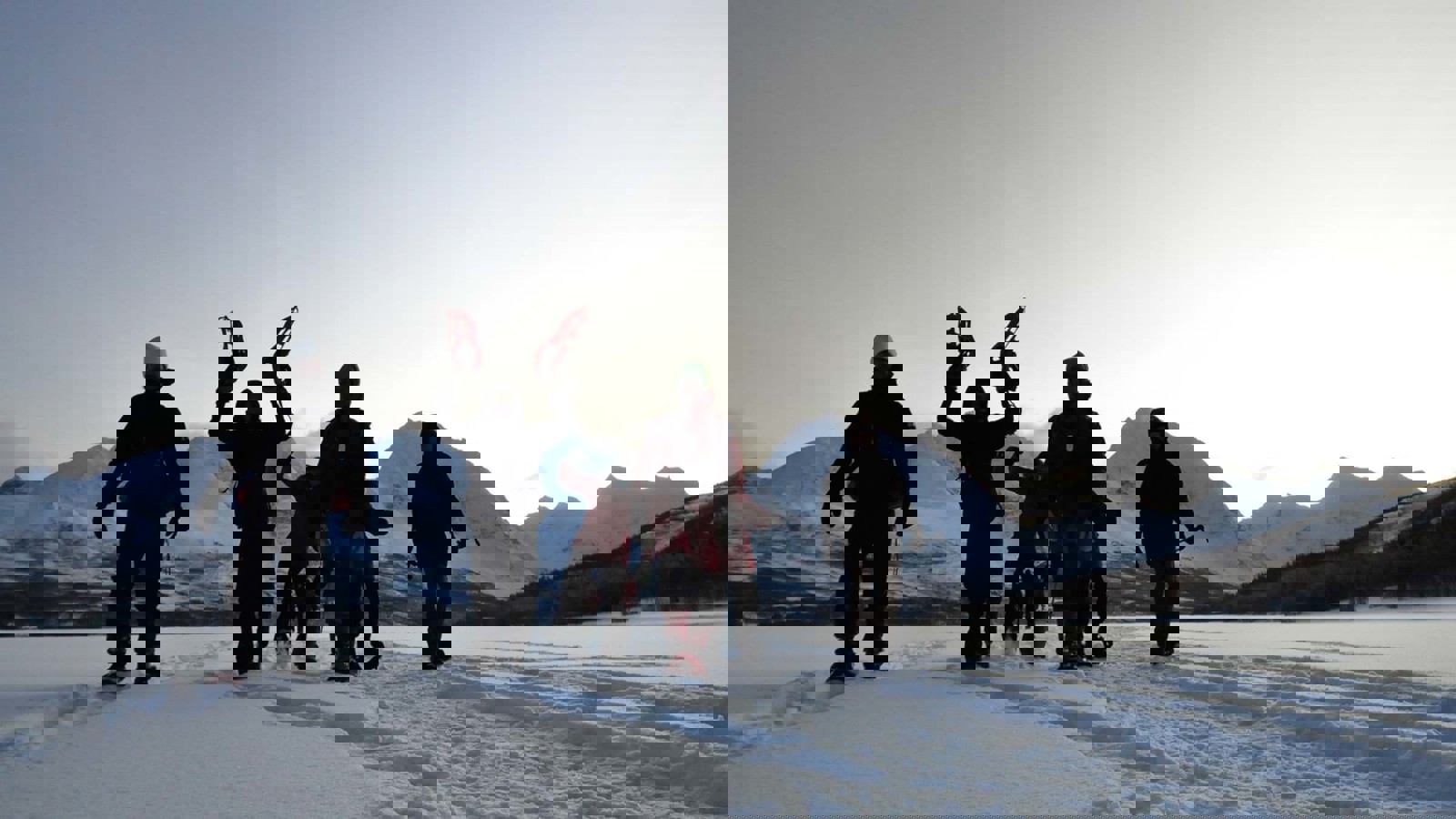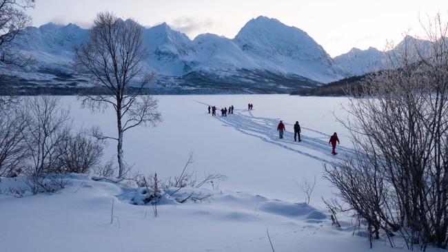 Vi startade dagens äventyr med en landstigning vid Jaegervatnet och en vandring med snöskor i lugn och behaglig takt. Solen sken över de vita vyerna och snön absorberade alla ljud – all eventuell storstads-stress var nu som bortblåst!