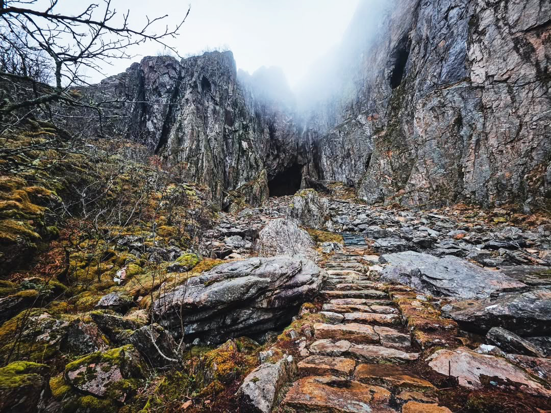 Vi anlände till Torghatten i vind och regn – ett beryktat berg med ett hål rakt igenom. Orubbliga tog vi oss i land med våra Zodiacs och vandrade genom grottan, medan regnet avtog och vackra vyer uppenbarade sig.