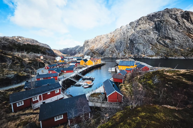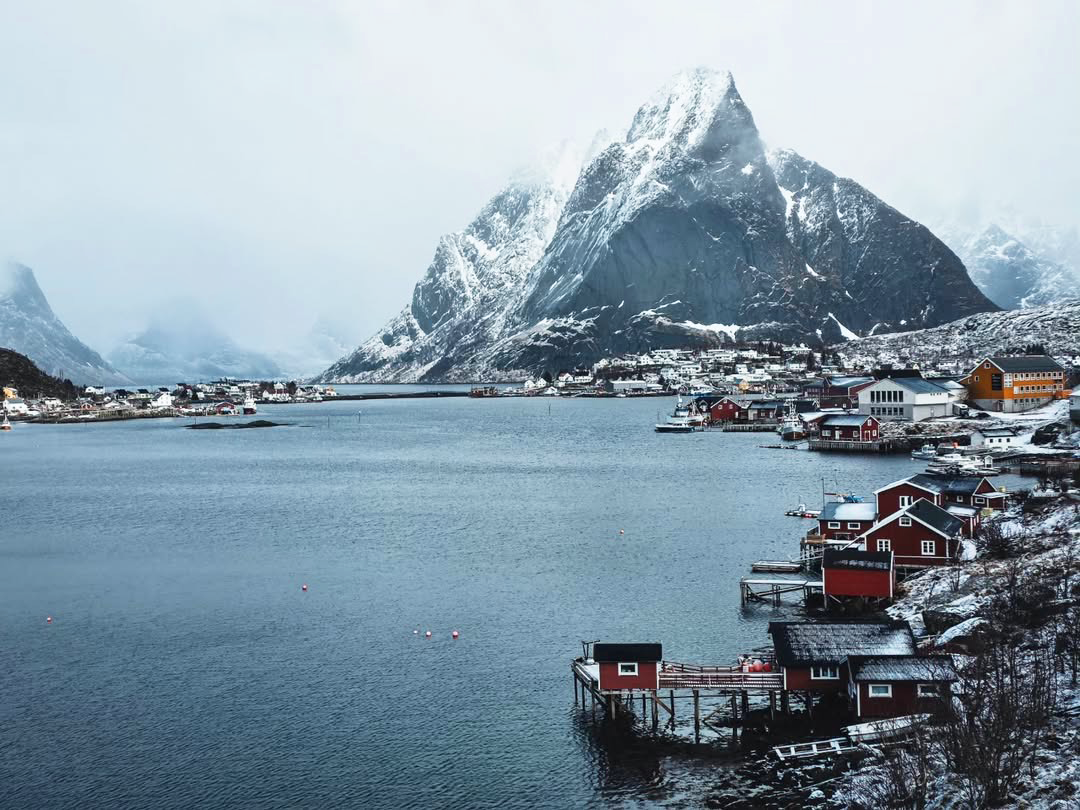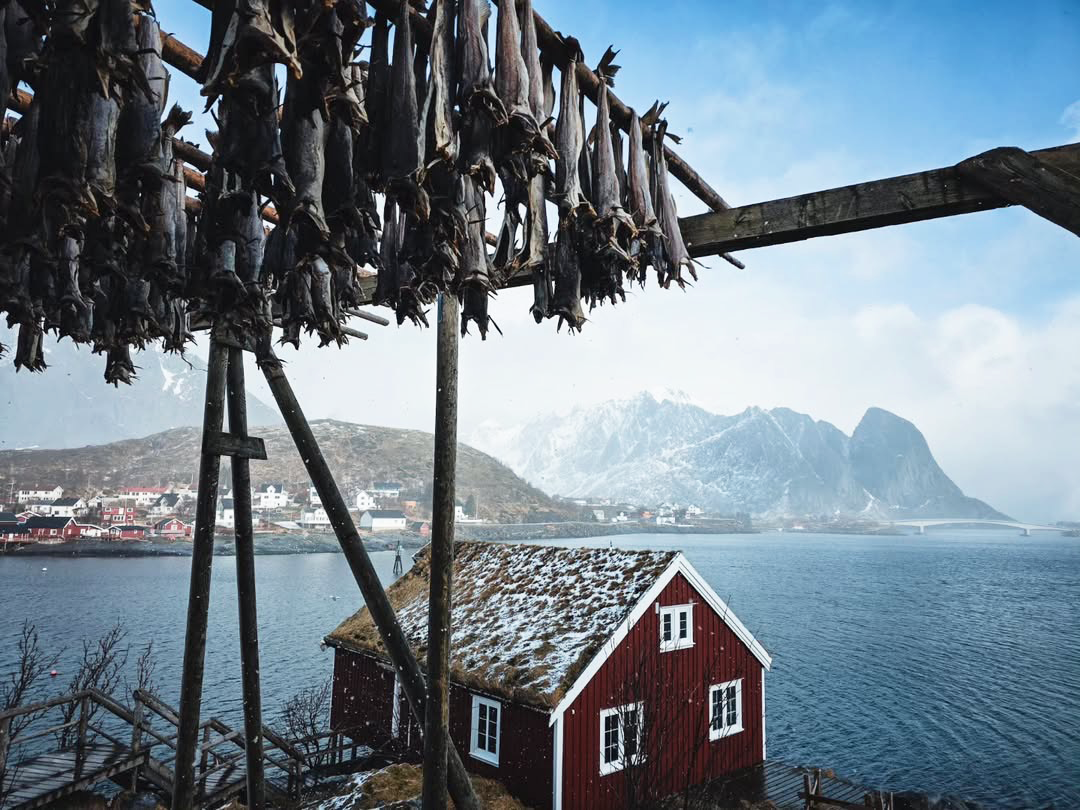 Vi började i Reine, en pittoresk by med en fond av torkställningar för torsk och röda hus.