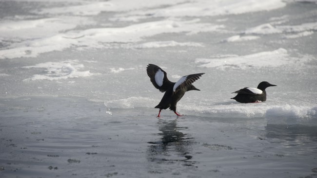 Så seglade vi in i Isfjorden, nordlig vind drev oss och vattnet framför sig. I Trygghamna ankrade vi i lä för vår sista utflykt. Här besökte vi en liten glaciär famnad av stora isflak, fick många besök och nyfikna blickar av en liten vikare och begav oss på jakt efter praktejdern. Det lyckades nog alla att få en glimt av denna ståtliga fågel, inklämd bland sina nära släktingar, den vanliga ejdern.