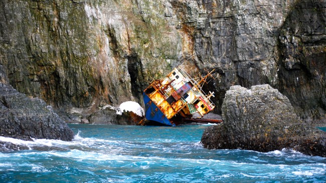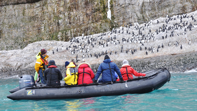 Där! Ur havet en mäktig klippfront, lång, viskande dyning och nästan ingen vind. Ankrade i Sörhamna började vi vår Zodiactur vid fågelklippan, en överväldigande uppenbarelse. Att måla i ord låter sig inte göras: ett hav fyllt av grisslor, luften av myggsvärmar kring boplatserna. I prydliga rader de frack-klädda grisslorna, och den tretåiga måsens gälla skri. Vittrut, havstrut och storlabb på plats i sitt skafferi, enstaka lunnar. Vid kanten av en matta av grisslor några havssulor, de nordligaste i världen, nykomlingar i en mångtusenårig koloni. Tunnlar o grottor, tinnar och vittrande torn, fristående raukar i vattnet. Mer dramatiskt än så är det svårt att föreställa sig, och så mycket befjädrat liv återspeglar ju havets massiva produktivitet. Utflykten skall sent glömmas.