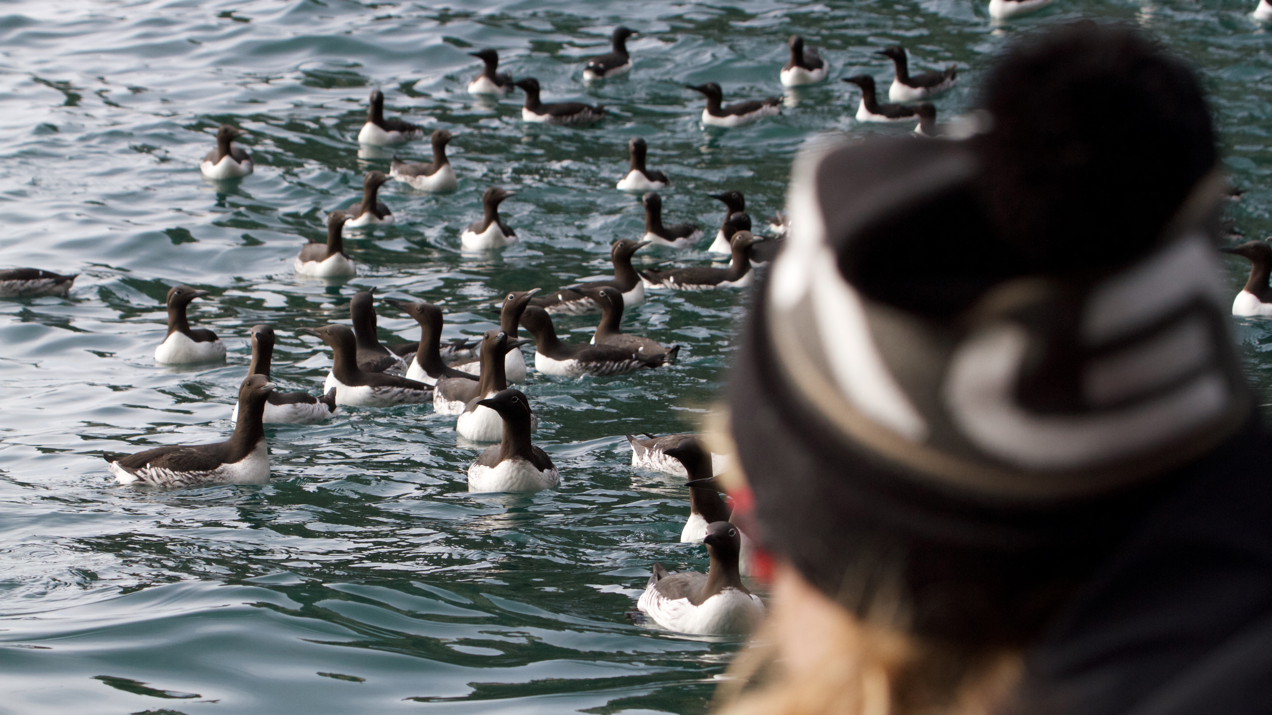 Det är sådana här dagar vi drömmer om! Nu tryggt ankrade i skyddande Sørhamna klev vi i våra gummibåtar i perfekta förhållanden. Himlen var full av stormfåglar, tretåig mås och gråtrutar. Här fanns också en hel del spetsbergsgrissla bland de mer vanliga sillgrisslorna. Havsytan var helt svart av dem och så fort vi stannade gummibåten så simmade de orädda fram för att hälsa.