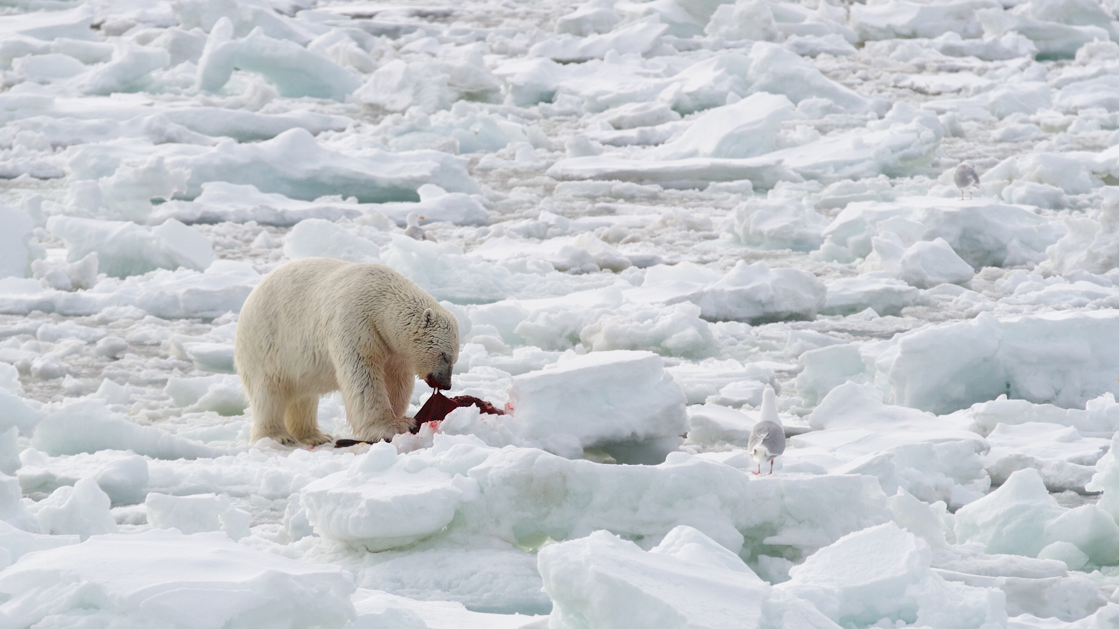 Efter lunchen fortsatte spaningen men det var inte Adam som upptäckte isbjörnen utan Helena. Den simmade bland isflaken där det låg grönlandssälar i massor. Vad skulle ske? Spänningen steg när styrman Magnus sakta, sakta närmade sig isbjörnen och helt plötsligt hävde den sig upp på ett isflak – med en säl i munnen! Det hade tagit den från vattnet utan att vi sett det. Den började spisa sitt byte i sakta mak, men rätt som det var valde den att gå i vattnet igen. Vi följde den noggrant med våra kikare för att se den ta sikte på nästa säl och innan vi hann hämta andan ser vi den dra ned sälen i vattnet bakifrån. Aldrig tidigare har vi beskådat något sådant beteende! Vi var alla häpna över det vi bevittnat och när vi lämnade platsen bakom oss såg vi isbjörnen spisa på ett av sina byten igen.