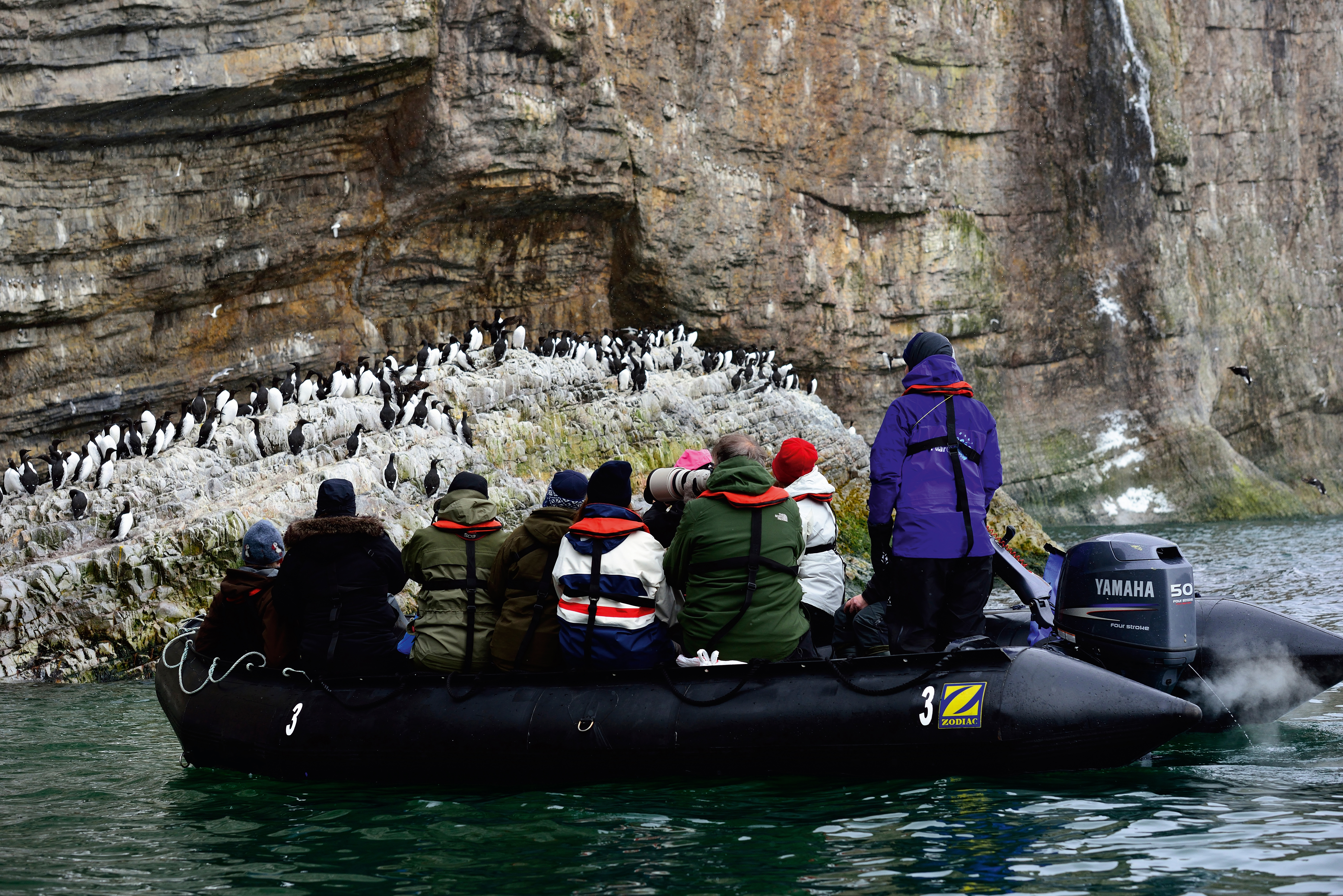 Nästa mål är den mytomspunna Björnön, som ligger mitt emellan Nordnorge och Svalbard. Dess utsatta läge gör det sällsynt att kunna gå i land, men om vädret tillåter kan vi göra en spännande Zodiackryssning bland dramatiska klippor med tinnar, torn och grottor.