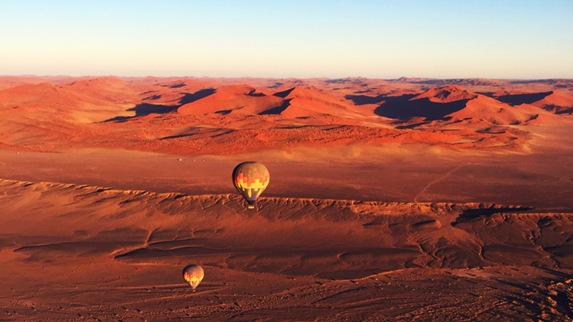 Det är en mycket besynnerlig och fantastisk känsla att sakta glida upp i luften, uppburen av endast varmluft, och vad kan vara mer spektakulärt att göra detta än just här ovan Namiböknen? Vi såg nu från ovan hur landet låg, hur Tsauchab-floden strävat sig in i sanden på sin väg mot havet och hur stora sanddynerna var. De sträckte sig västerut så långt vi kunde se. De andra två ballongerna gav perspektiv till allting och vi till och med strök trädtopparna med gondolen. Efter en sportig landning bjöds det på frukost mitt ute i öknen.