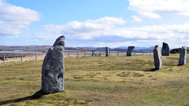 Efter lunchen i det hebridiska solskenet besökte vi de stående stenarna i Calanais. Dessa otroligt stora och fascinerande stenbumlingar restes av neolitiska bönder för ungefär 5000 år sedan och ger ett imponerade intryck. Ända sen dess har stenarna stolt stått och överblickat Loch roag och kullarna i horisonten som liknar en stor kvinnofigur, en “jordmoder”.