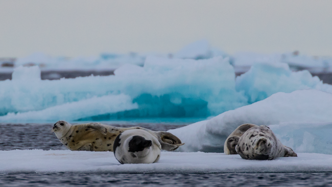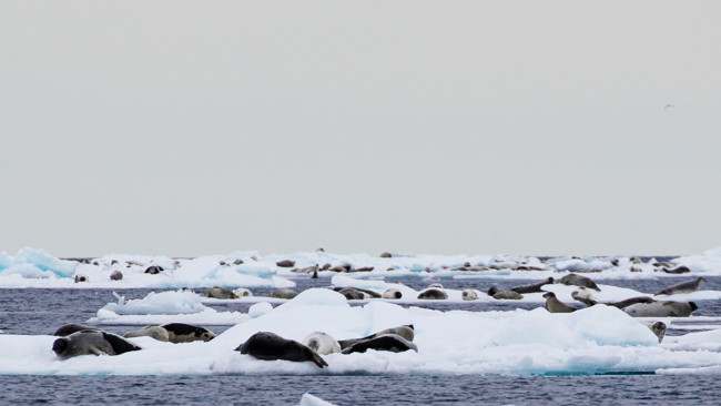 Dagens mål var packisen. Under de flesta år når isen hela vägen ner till norra Svalbard, men i år år är havet där helt isfritt. Efter sju timmars seglats norrut når vi äntligen packisen tidigt på morgonen. Mängder av stormfåglar, alkekungar och spetsbergsgrisslor söker efter föda över isen och enstaka storsälar vilar på isflak som vi seglar förbi. Precis innan lunch upptäcker vi en stor grupp sälar som vilar på isflak långt bort i horisonten. När vi kommit lite närmare upptäcker vi att många av dem har svart och vit päls - det är grönlandssäl! Denna karismatiska sälart är starkt knuten till packisen uppe i norr och det är sällan vi lyckas få bra observationer av denna art. Nu har vi över tusen grönlandssälar framför fartyget samtidigt! Efter en snabb lunch sätter vi våra Zodiacer i vattnet i hopp om att komma sälarna närmare och genom att långsamt paddla närmare lyckas vi spendera mer än två timmar tillsammans med sälarna innan vi måste ge oss av tillbaka till fartyget.