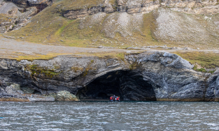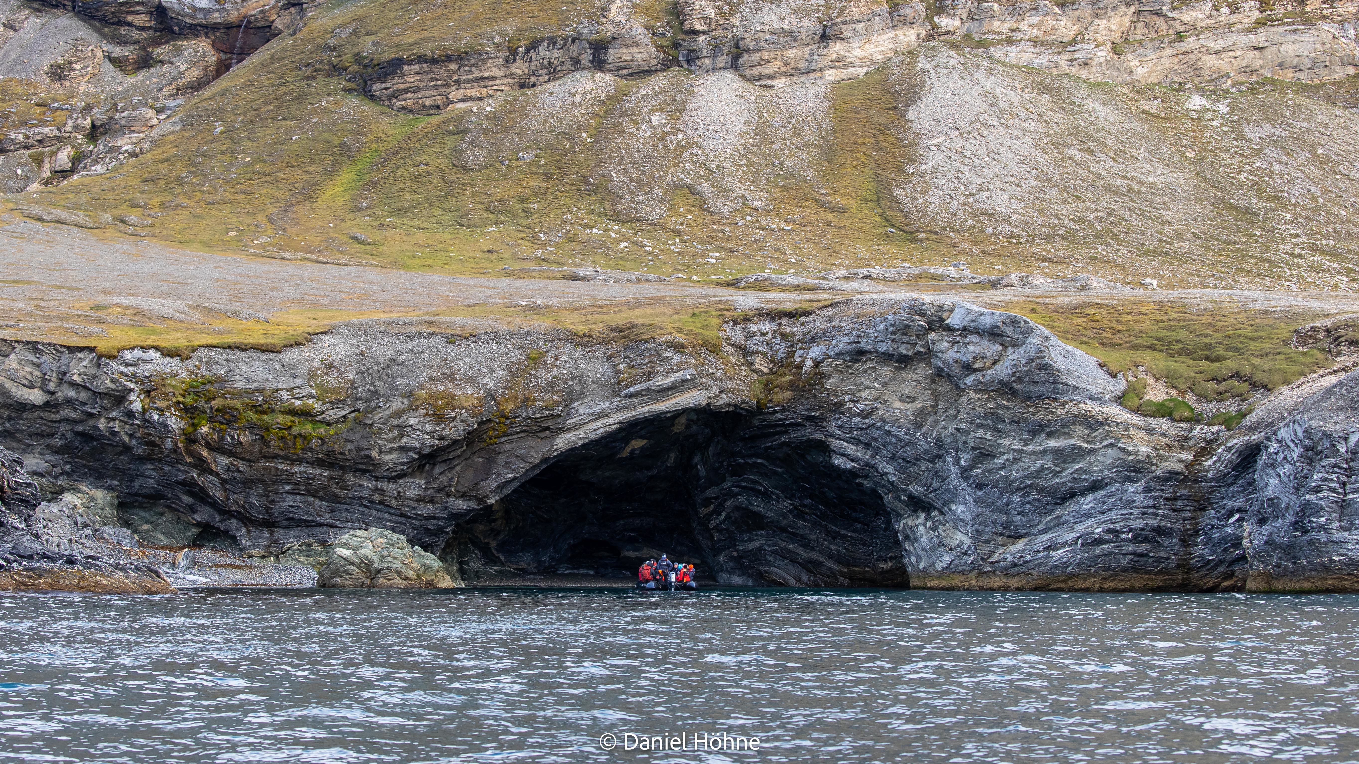 Vi sjösatte fyra Zodiacer och styrde först mot en imponerande grotta vid kusten. Ingången var tillräckligt bred för att rymma alla våra båtar samtidigt, och inne i grottan upptäckte vi en dold värld av skuggor och den salta doften av tång. Längst in i grottan ledde en mindre tunnel vidare, så låg att endast de som var villiga att krypa kunde ta sig igenom. Det var en äventyrlig start på vår morgon.