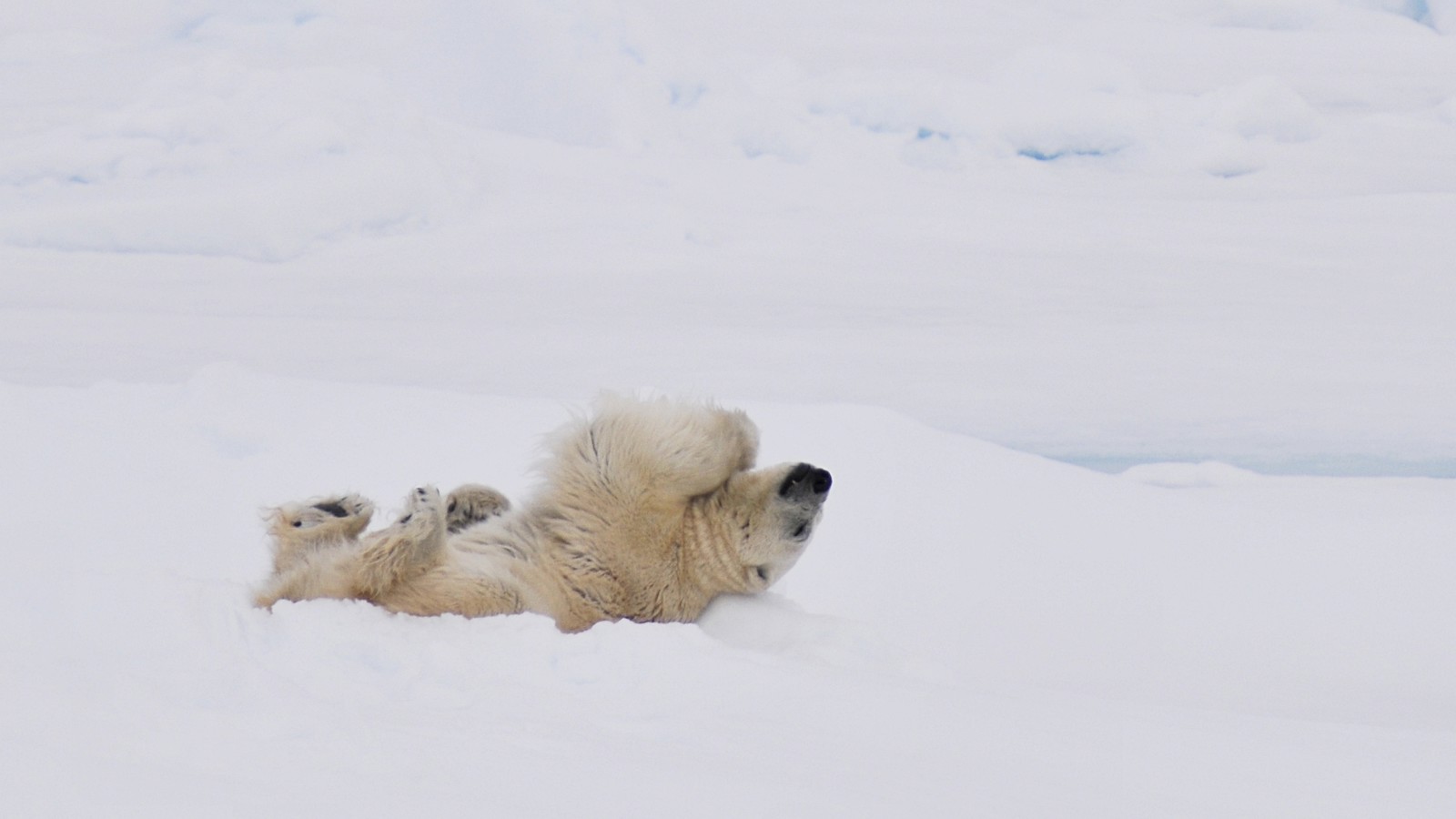 Bryggan väckte oss guider några gånger då björnen började röra lite på sig, men oftast sträckte den bara lite på sig för att sedan lägga sig ner igen. Men nu på morgonen, innan frukost, reste han sig på riktigt och kom lunkandes mot oss, ända fram till fartyget! Då kunde vi tydligt se att det var en ung hanbjörn. Han verkade inte veta vad människor är, utan höll upp näsan och vädrade nyfiket hela tiden. När han bestämde sig att lämna oss, vände han oss ryggen, bajsade och gick sin väg mot kanten av isflaket där han gott lade sig ner igen.