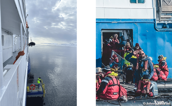 Medan besättningen och guiderna sjösätter de fem Zodiacerna, förbereder vi oss genom att klä oss i lager på lager. I Norge är det lag på att bära flytdräkt vid utfärder med Zodiacs, så snart står vi alla samlade i röda overaller, redo att ta oss ner för rampen och i gummibåtarna. Overallerna är värmande, vilket är skönt när man ska sitta still utomhus i några timmar.