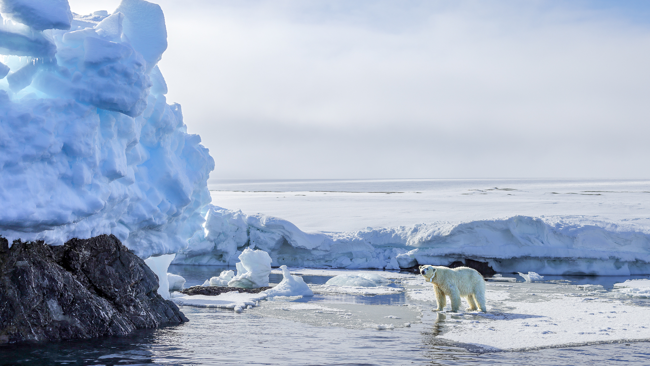 Tyst och sakta, på behörigt avstånd, glider vi längs iskanten där vi kan se isbjörnen i fjärran. Vår guide har fastställt att det är en relativt ung isbjörnshona. Hon lufsar fram och skuttar om vartannat på isen, lekfull i sina rörelser. Plötsligt får hon tag i en ruska som hon drar upp ur havet och börjar leka med, likt ett barn. Då och då plumsar hon i vattnet, bara för att klättra upp på isen igen och torka i den kyliga luften. Till sist går hon längst ut på iskanten, sätter sig ner och poserar.