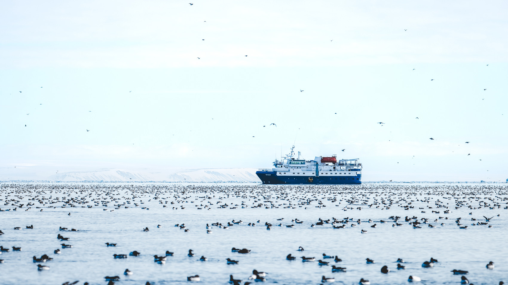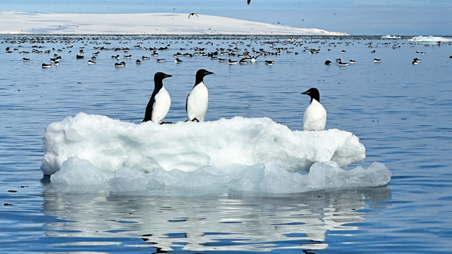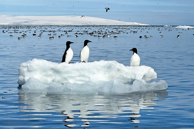 Vi närmar oss Alkefjellet med Zodiacerna. Den majestätiska basaltklippan syns på långt håll och ju närmare vi kommer, desto tydligare blir ljudet av många, många fåglar. Spetsbergsgrisslor. Vi ser även en stor samling av dem som flyter på vattenytan eller seglar på små isflak i väntan på att klippan ska bli mer snöfri så att de kan hitta en avsats att häcka på. Mängden av dessa svartvita fåglar är överväldigande. Och detta är bara början. Under sommaren samsas hundratusentals häckande par om de smala klipphyllorna. Vår guide berättar att de lägger sitt enda ägg på en yta som är mindre än 10 cm. För att ägget inte ska rulla över kanten är det konformat. Symbiosen mellan de vilda djuren och naturen är minst sagt fascinerande, som om allt är millimeteranpassat.