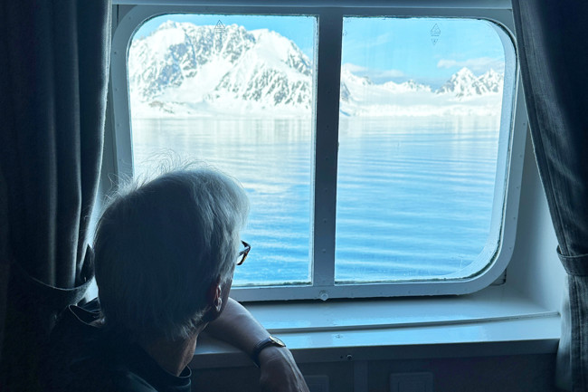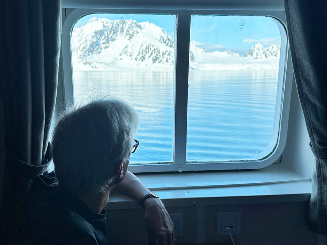 Klockan 07.15 väcks vi av expeditionsledarens glada stämma i högtalaren. Han meddelar att vi har en strålande dag att se fram emot och att frukosten snart serveras. Solens strålar letar sig igenom springan i de mörkläggande gardinerna. Eftersom det är maj månad och vi befinner oss i midnattssolens rike, där det varit ljust hela natten, har sovmasken hjälpt till att hålla det mörkt.