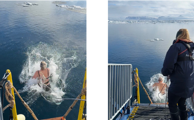 Vi kommer tillbaka till fartyget, och mitt i den eufori som infunnit sig erbjuds ett polardopp. Förutsättningarna kunde inte vara bättre. Vi har haft en fantastisk dag – solen skiner, och bakgrunden av snöklädda berg och drivande isflak på spegelblankt vatten är svårslagen.