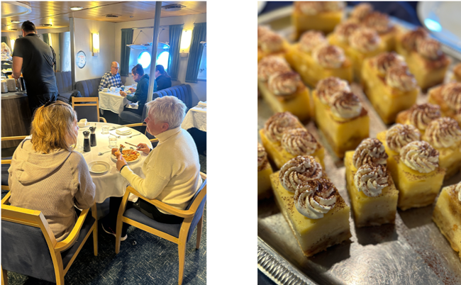 Väl ombord på M/S Quest igen ges en kort stund för ombyte och tid på hytten för de som önskar. Sedan är det dags för lunch vilket också är ett tillfälle att samtala kring förmiddagens upplevelser.