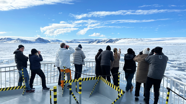 Efter en stärkande frukostbuffé är det dags för dagens första utfärd. Flera av gästerna samlas förväntansfullt runt en whiteboard med ett handskrivet schema. Här framgår dagens plan. Då resans rutt styrs mycket av väder- och isförhållanden, uppdateras detta dagligen. I dag är fågelklippan Alkefjellet först på agendan.