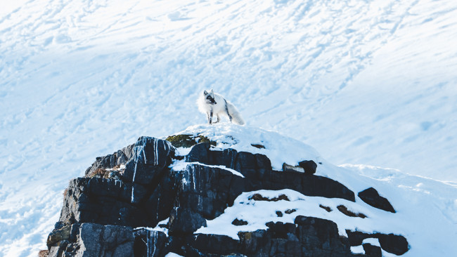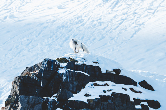Vi har fått höra att det inte sällan syns polarrävar runt fågelklippan, men oftast senare under säsongen. Men just när vi är på väg bort från fågelmekkat får vi syn på en. Den står spanandes på en snöklädd liten klippa, i gråvit päls, som en symbol för det pågående skiftet från vårvinter till sommar.