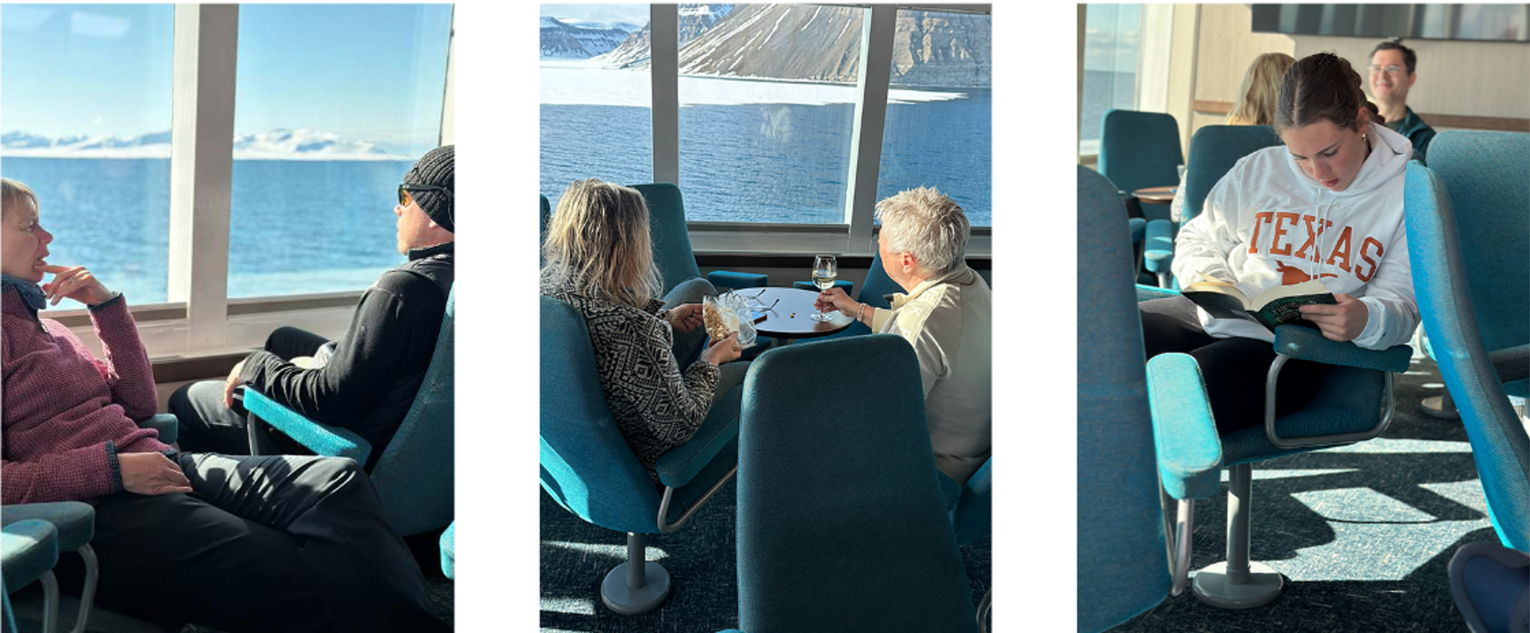 Efter middagen är det fria aktiviteter ombord. Många väljer att slå sig ner i panoramaloungen med ett glas vin, en bok eller en kikare. Andra håller till ute på däck och njuter av att bara vara här och nu, och av solen som inte kommer att gå ner förrän i slutet av augusti.
