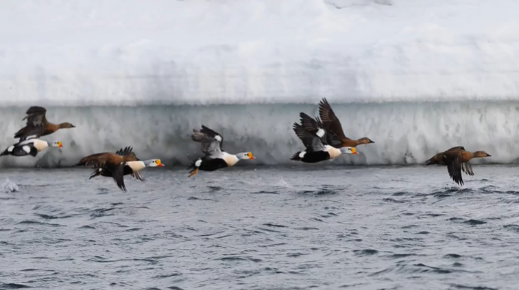 Turen började med att vi följde den kant av fast havsis som låg i Raudfjorden. Längs de branta bergssluttningarna fanns flera spår av både isbjörn och räv. En säl stack upp sitt huvud över vattenytan nära våra båtar, men dök snabbt ner under ytan igen. Vi utforskade Raudfjordens södra kustlinje tills vi nådde fågelberget i Hamiltonbuktas mynning.