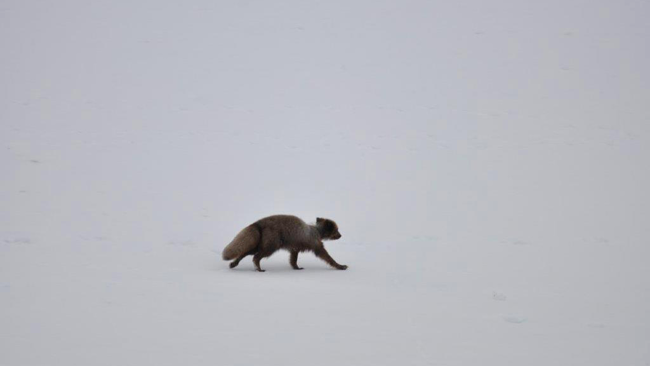 Medan vi tog in Svalbards tystnad visade sig vår vän blåräven igen. Mellan stenarna i den klippiga sluttningen hoppade den fram och vi kunde följa dessa framfört över hela sluttningen. På Svalbard finns det fjällräv med blåsvart päls och fjällräv med vit päls.