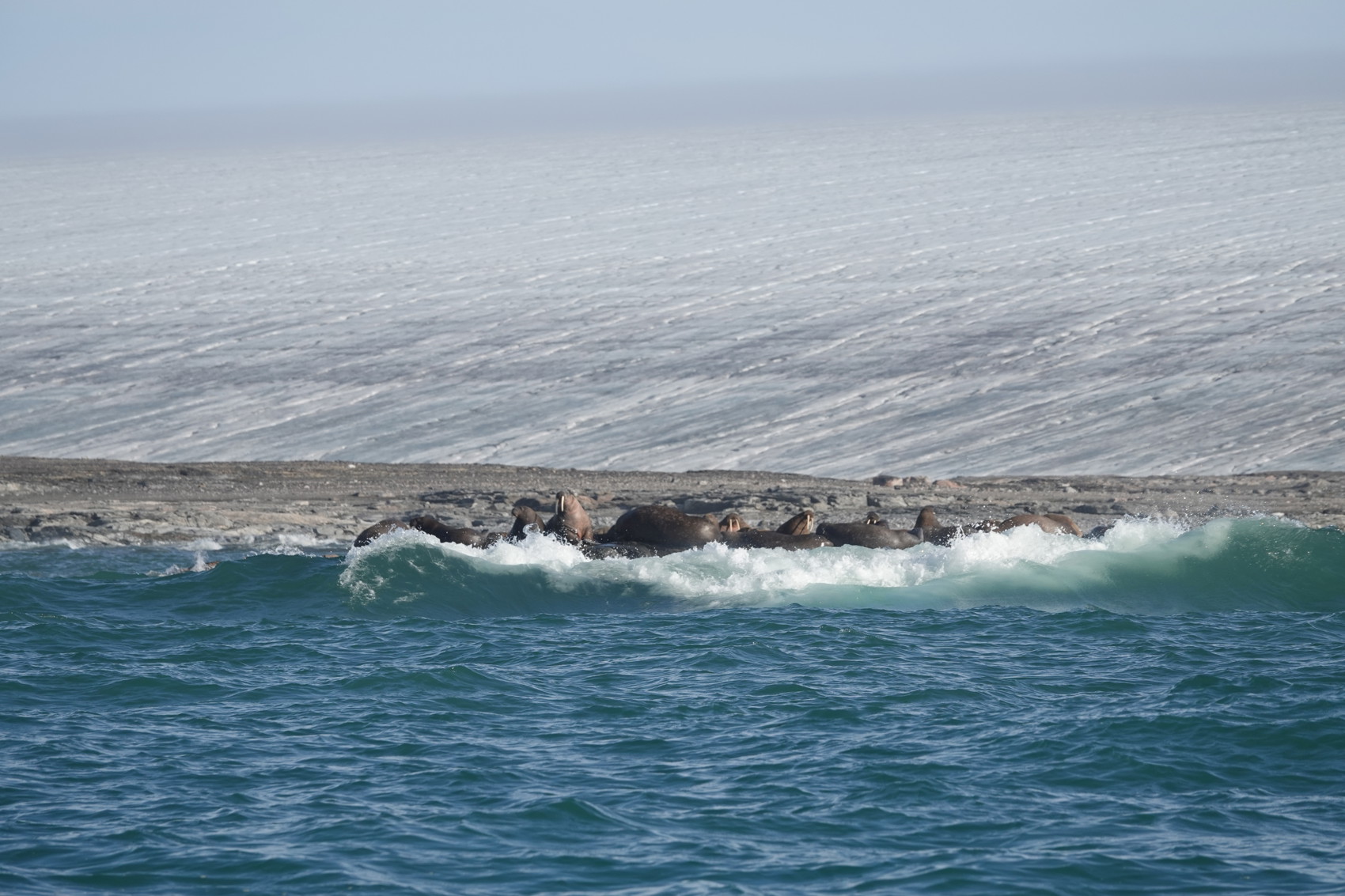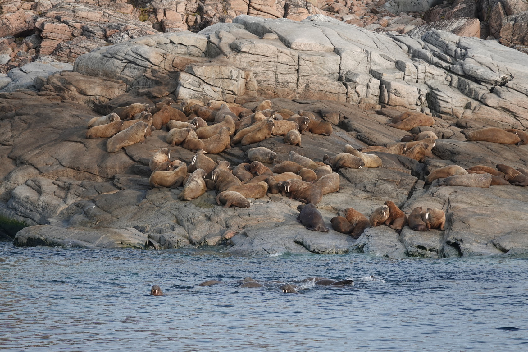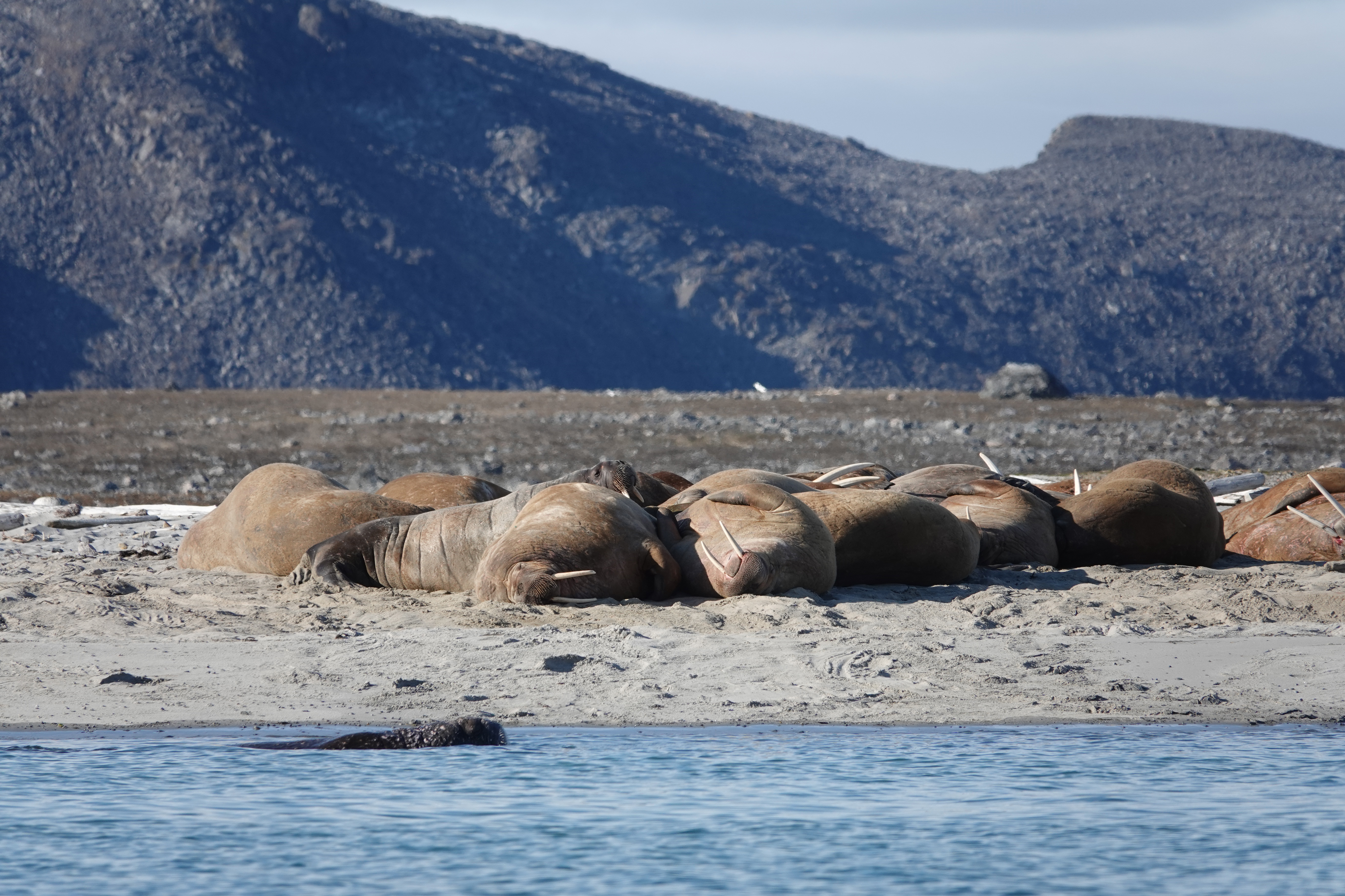 Färden gick vidare tillbaka mot Hinlopens södra delar. Den lilla Langeøya var målet och där ankrade vi upp. Här finns det bl.a. en valrosskoloni som ofta håller till på en fin strand. Vid landstigningen kunde vi se en fjällräv på ganska nära håll, men efter att ha tittat på oss, tack och lov precis så länge så vi kunde ta några bilder så sprang den iväg. Vi gjorde sen en hikingtur på ön och kunde igen stifta bekantskap med Svalbards växtlighet. När vi kom tillbaka till stranden hade valrossarna flyttat lite på sig, några simmade runt. De var helt tydligt nyfikna på oss. Deras beteende upprepade sig, de närmade sig oss i grupp, kikade upp och simmade iväg som grupp. Nästa gång kom de lite närmare och sedan ännu närmare gången därefter. Vi satte oss alla ner på stranden och satt helt stilla och tyst. Valrossarna kom närmare och närmare och bjöd verkligen på sig själva. Vilka härliga djur.