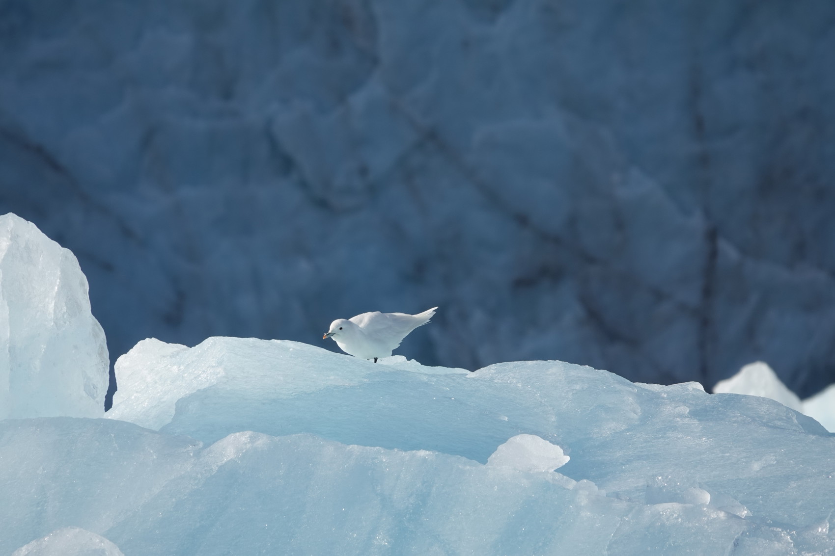 Nästa dag kom vi till Monacoglaciären i Liefdejorden. Vädret var helt fantastiskt. Solen strålade från en klarblå himmel när vi kom fram. Vädret skiftar snabbt här, så man får vara beredd på allt - sol, snö, regn, vindstilla, blåst, dis - inom korta tidsrymder. Men den här dagen var det solen och den blå himmeln som hade valt att vara med oss. Vi seglade runt med zodiacerna i flera timmar. Monacoglaciären kalvar ofta och vi fick både se och höra detta ett antal gånger. En riktigt stor kalvning kom också vid ett tillfälle. Det är mäktigt att se och höra detta! Vågorna från kalvningarna är klart märkbara. Det är stora krafter i spel. Många fåglar flög omkring här. De finner ju föda vid glaciärerna efter kalvningar. Här fångade jag en ismås på bild.