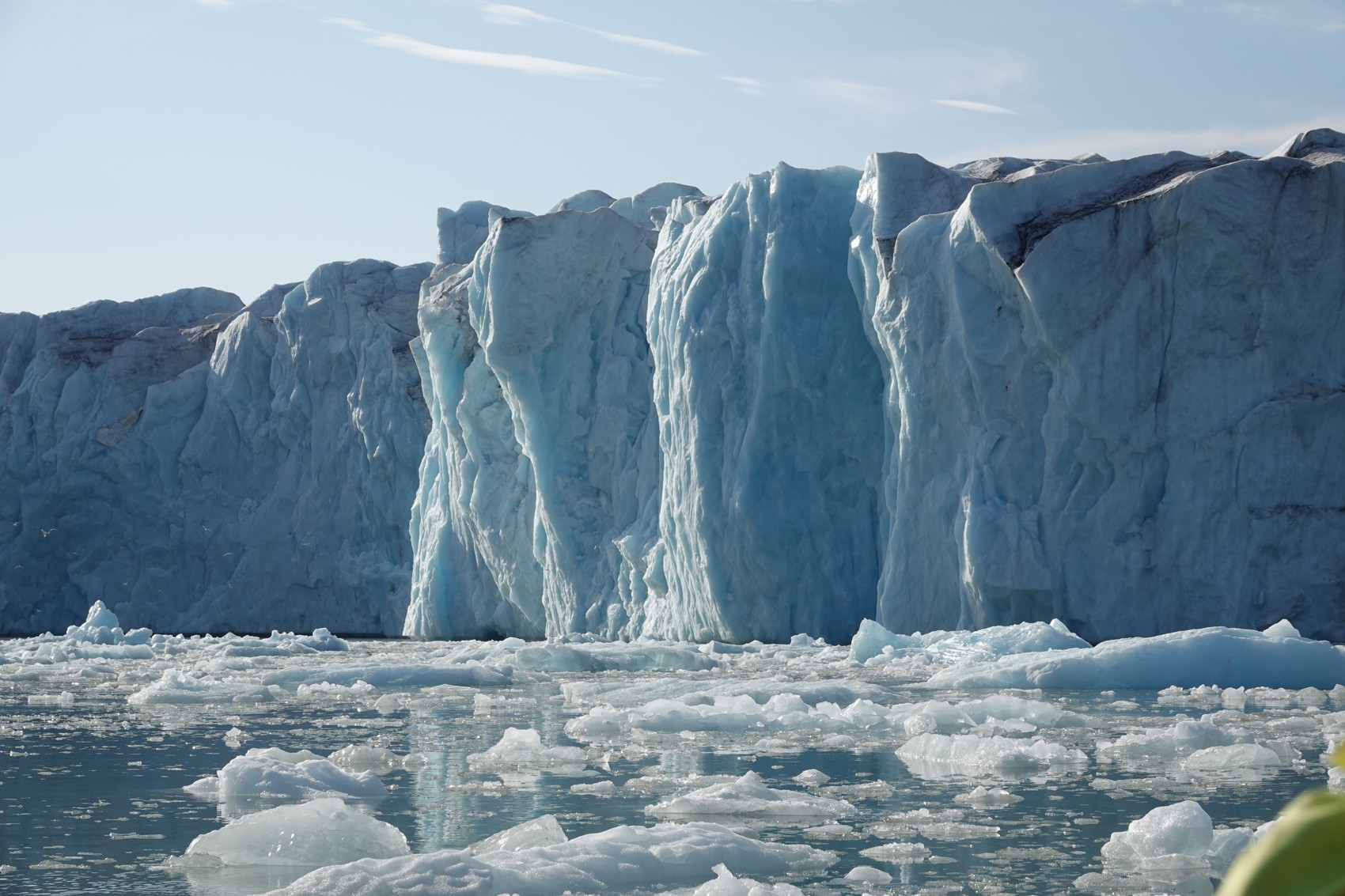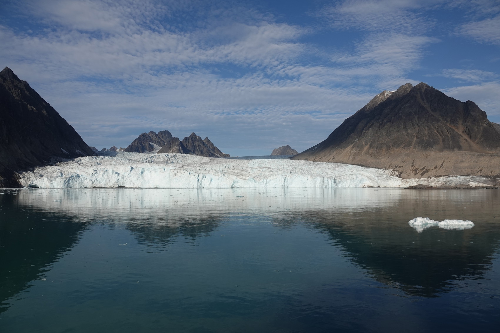 Innan vi kom till Virgohamna på Danskön, resans första landstigning och även den första Andrée-upplevelsen, gjorde vi en sväng inom Smeerenburgfjorden. Dess mäktighet är översvallande, så många glaciärer som mynnar ut i den här fjorden. Spåren av glaciärkalvningar syns också tydligt med all is i det grönskimrande vattnet. Det finns en märklig tystnad i dessa fjordar som bryts lite då och då av kalvningar och ljuden från det rikliga antalet fåglar.